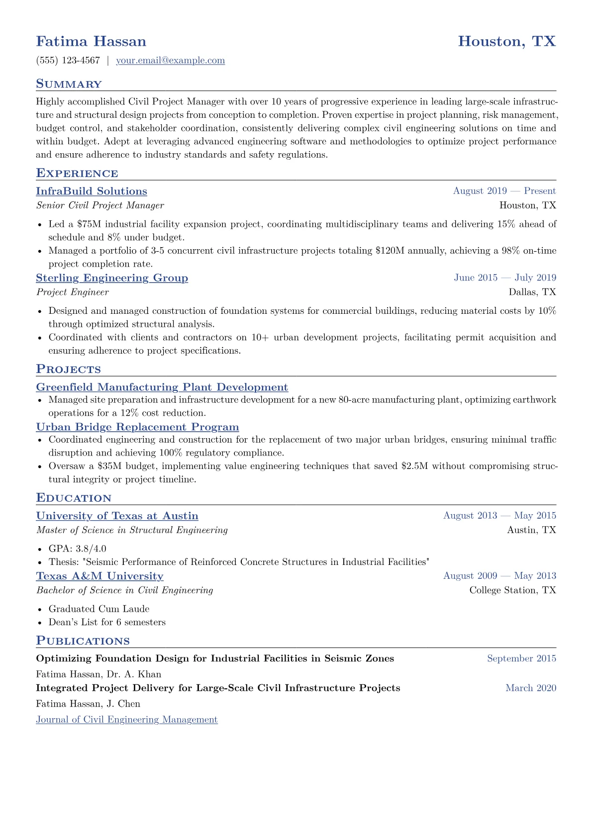 This example CV excels by concretely quantifying project achievements, demonstrating the financial impact and scale of previous roles. It effectively details responsibilities such as overseeing multi-disciplinary construction phases and managing budgets up to several million dollars. The resume thoughtfully groups skills under relevant categories like "Project Planning & Execution," "Stakeholder Management," and "Regulatory Compliance," which clearly articulate the candidate's holistic capabilities. Certifications and key software proficiencies are prominently highlighted, quickly communicating essential technical expertise.