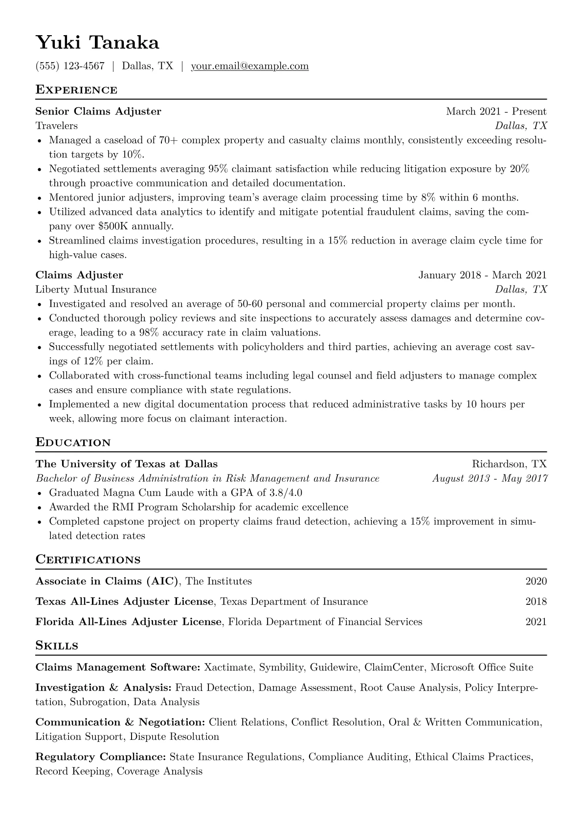 A strong mid-level Claims Adjuster resume in Finance & Banking must highlight precision, regulatory compliance, and significant financial impact. Hiring managers seek candidates who demonstrate efficient claim resolution, a deep understanding of policy nuances, and a proven ability to mitigate risk and manage liabilities effectively. The unique challenge lies in balancing client satisfaction with cost control and strict adherence to industry regulations.