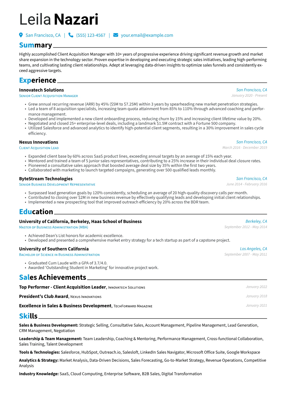 This template was built with JobSprout and can be remixed to create your own tailored Client Acquisition Manager resume.