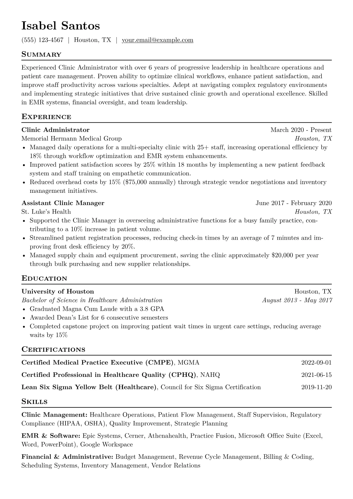 A strong Clinic Administrator resume for the healthcare sector meticulously details operational management and patient care efficiency. Hiring managers prioritize candidates who demonstrate success in streamlining patient flow, managing staff, ensuring strict regulatory compliance (like HIPAA), and overseeing revenue cycles. Concrete achievements such as reducing patient wait times by a specific percentage, improving appointment no-show rates, or successfully implementing EMR systems like Epic or Cerner are highly valued. Familiarity with billing codes, inventory control, and staff training protocols is also essential.