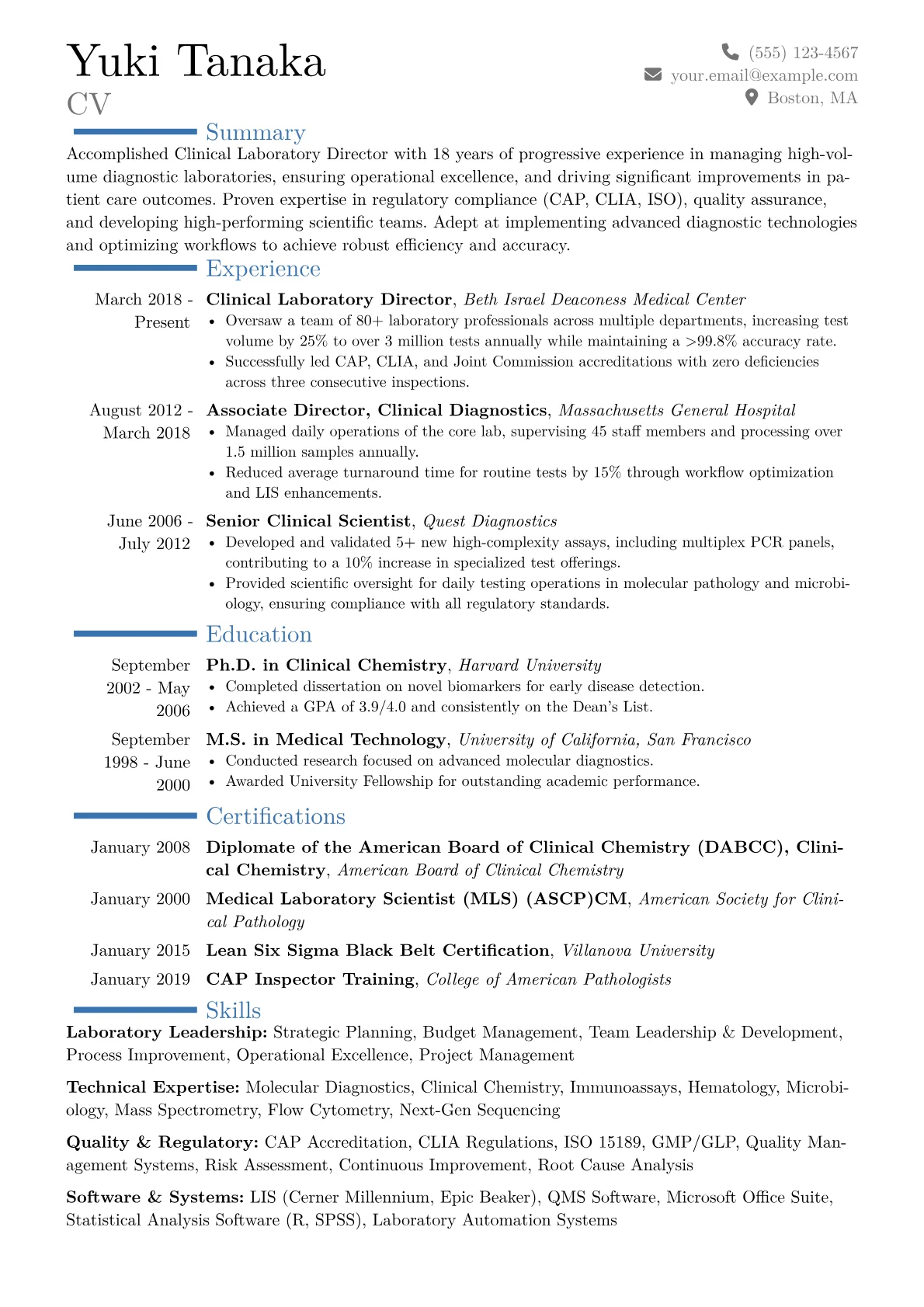 The JobSprout example effectively structures these high-level accomplishments. It quantifies impact, for instance, by detailing reductions in operational costs by a specific percentage or improvements in diagnostic accuracy, rather than merely listing responsibilities. Specialized skills are logically grouped, distinguishing regulatory expertise from technical proficiencies in molecular diagnostics or flow cytometry. Certifications like Lean Six Sigma and familiarity with leading LIS platforms such as Epic Beaker or Cerner Millennium are prominently featured, immediately signaling relevant executive-level capabilities.