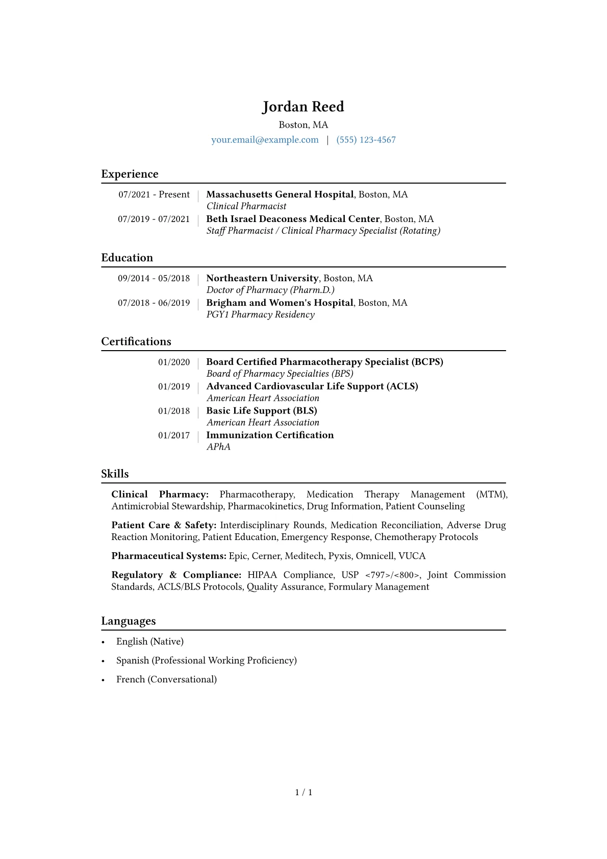 This template was meticulously built using JobSprout and can be easily remixed to create your own compelling Clinical Pharmacist resume.