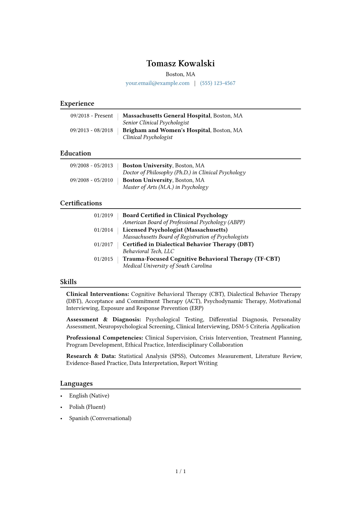 A strong Clinical Psychologist resume in Healthcare prioritizes demonstrated clinical expertise, patient-centered outcomes, and a commitment to evidence-based practice. Hiring managers seek specialized therapeutic modalities, experience with diverse patient populations, and contributions to improving mental health services. A unique challenge is effectively showcasing impact on patient well-being and clinical efficacy beyond just caseload volume.