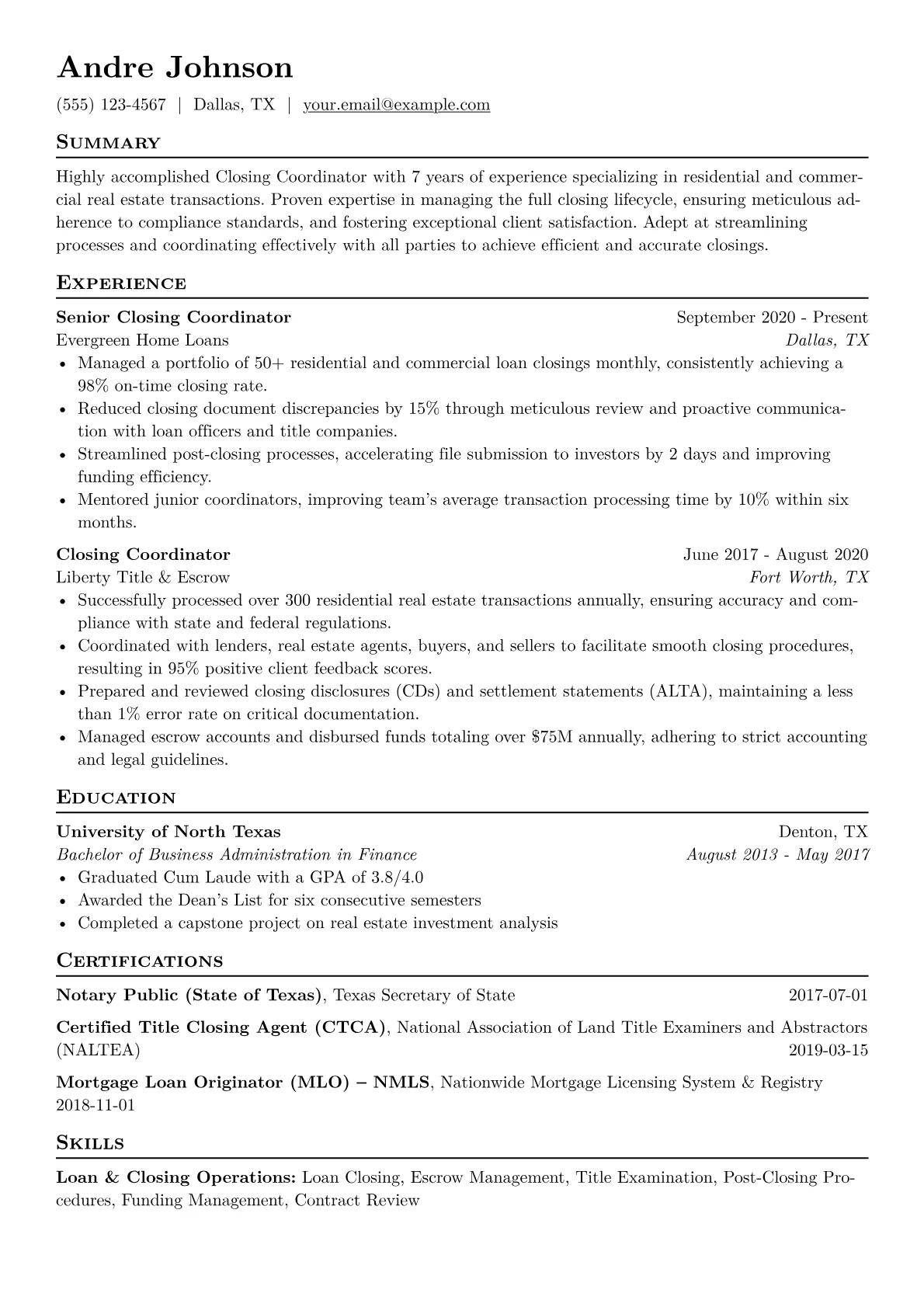 This example CV effectively highlights a Closing Coordinator's essential capabilities. It quantifies achievements by detailing the scale and impact of contributions, such as "orchestrated the timely closing of 250+ mortgage loans monthly" or "reduced post-closing audit discrepancies by 20%." Skills are thoughtfully grouped under headings like "Loan Origination Systems" (Encompass, Calyx Point) and "Compliance & Regulatory Knowledge" (RESPA, Dodd-Frank), providing clear insight into technical proficiencies. The resume also prominently showcases relevant certifications and financial software expertise, making it immediately apparent how the candidate contributes to precise and compliant transaction management.
