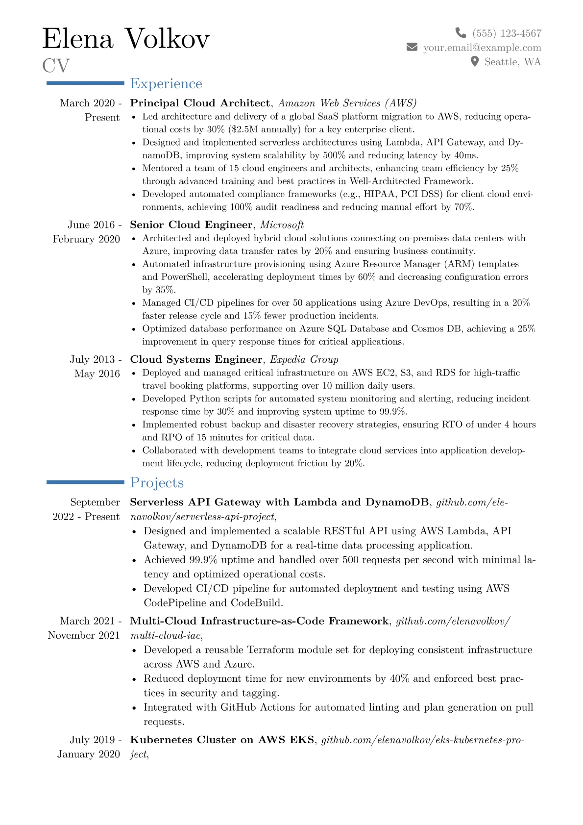 This particular resume example excels by featuring clearly quantified achievements, demonstrating tangible results like cost reductions and performance improvements on specific cloud projects. It prominently displays relevant, high-level certifications such as AWS Solutions Architect Professional, which are vital for this role, and thoughtfully groups technical skills by cloud platform and domain, offering a clear picture of the candidate's comprehensive capabilities.