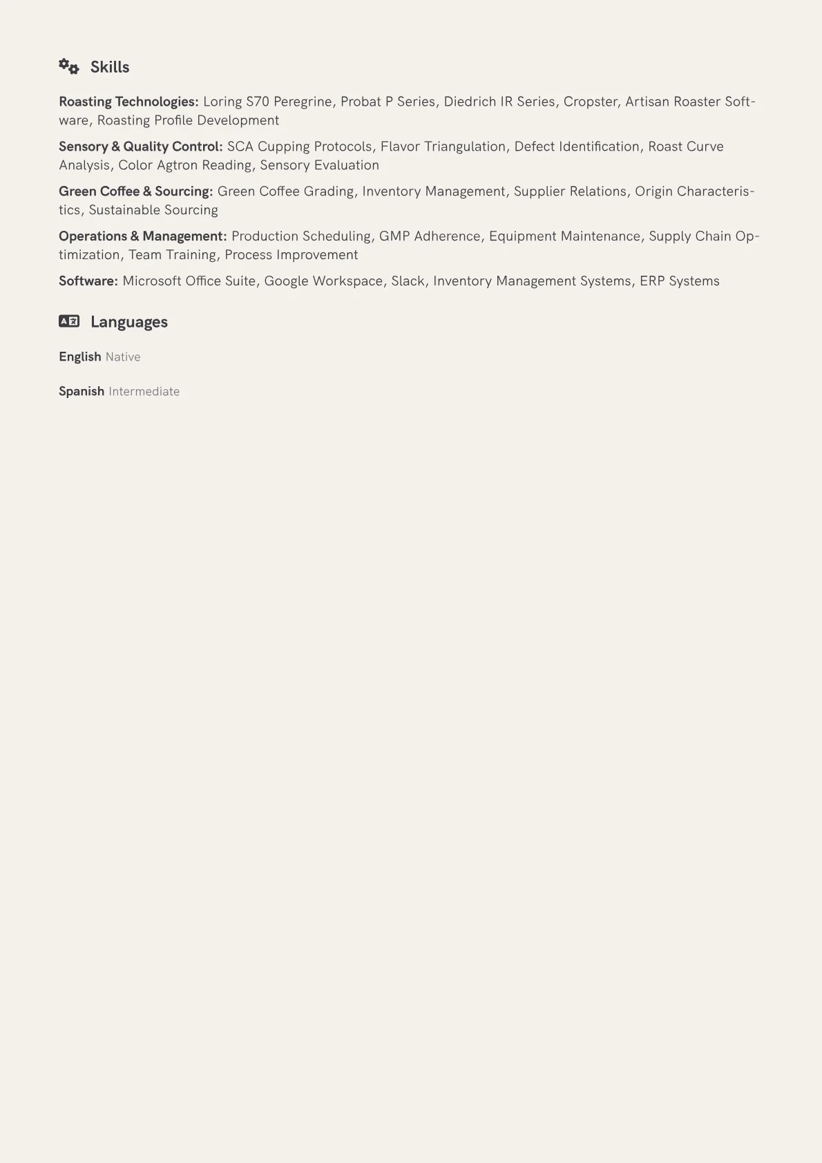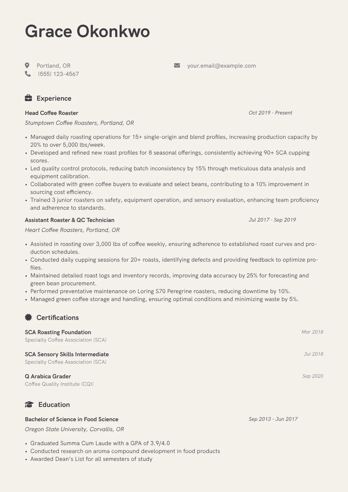 This example excels by highlighting quantified achievements, such as increasing production volume or optimizing roast consistency, providing concrete evidence of impact. Its clear skills grouping separates technical roasting abilities from sensory evaluation and business acumen, offering a comprehensive view. The inclusion of relevant certifications further validates expertise and commitment to industry standards.