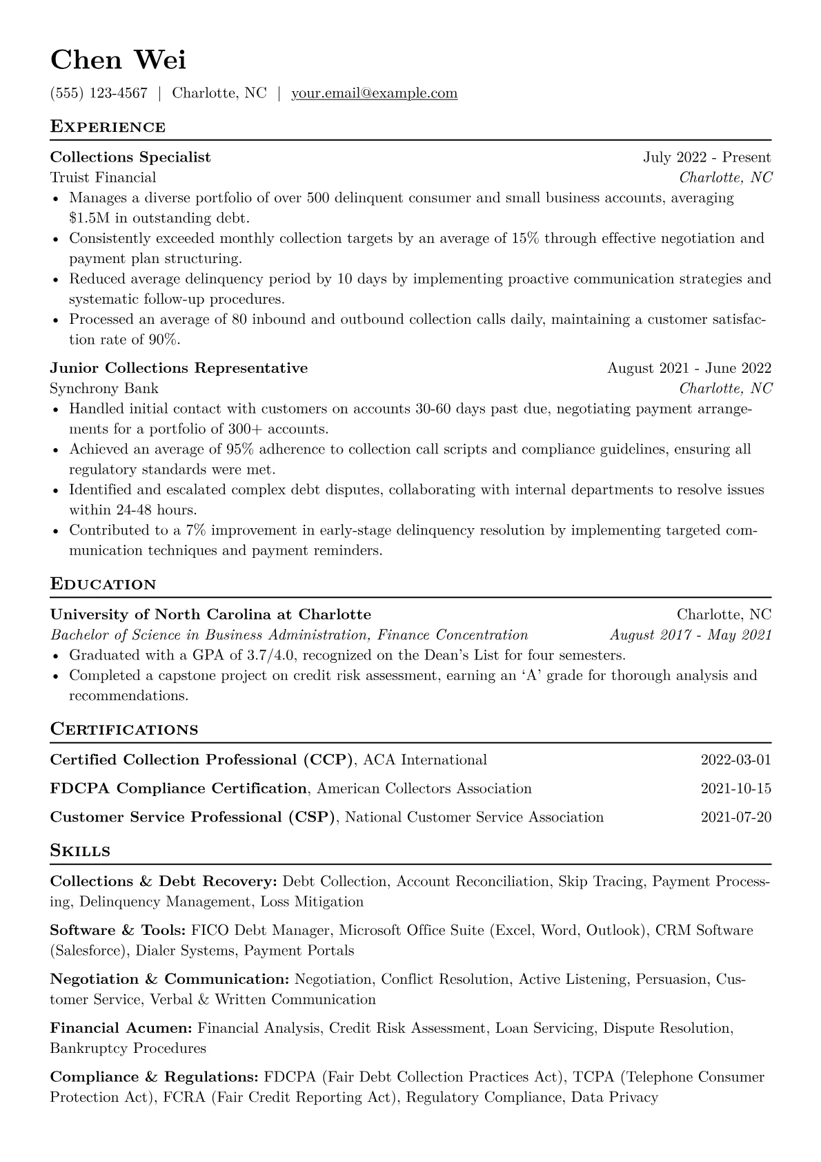 A strong Collections Specialist resume in Finance & Banking emphasizes clear communication, negotiation skills, and an understanding of financial regulations. Hiring managers seek candidates who can maintain customer relationships while recovering outstanding debts efficiently, making it crucial to highlight professionalism and results-oriented problem-solving. For entry-level roles, demonstrating potential for impactful contributions is key.