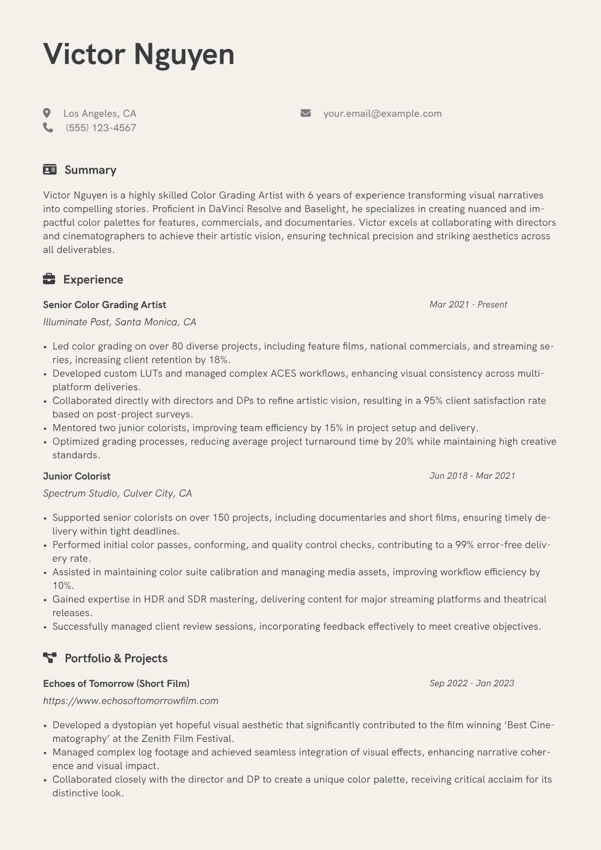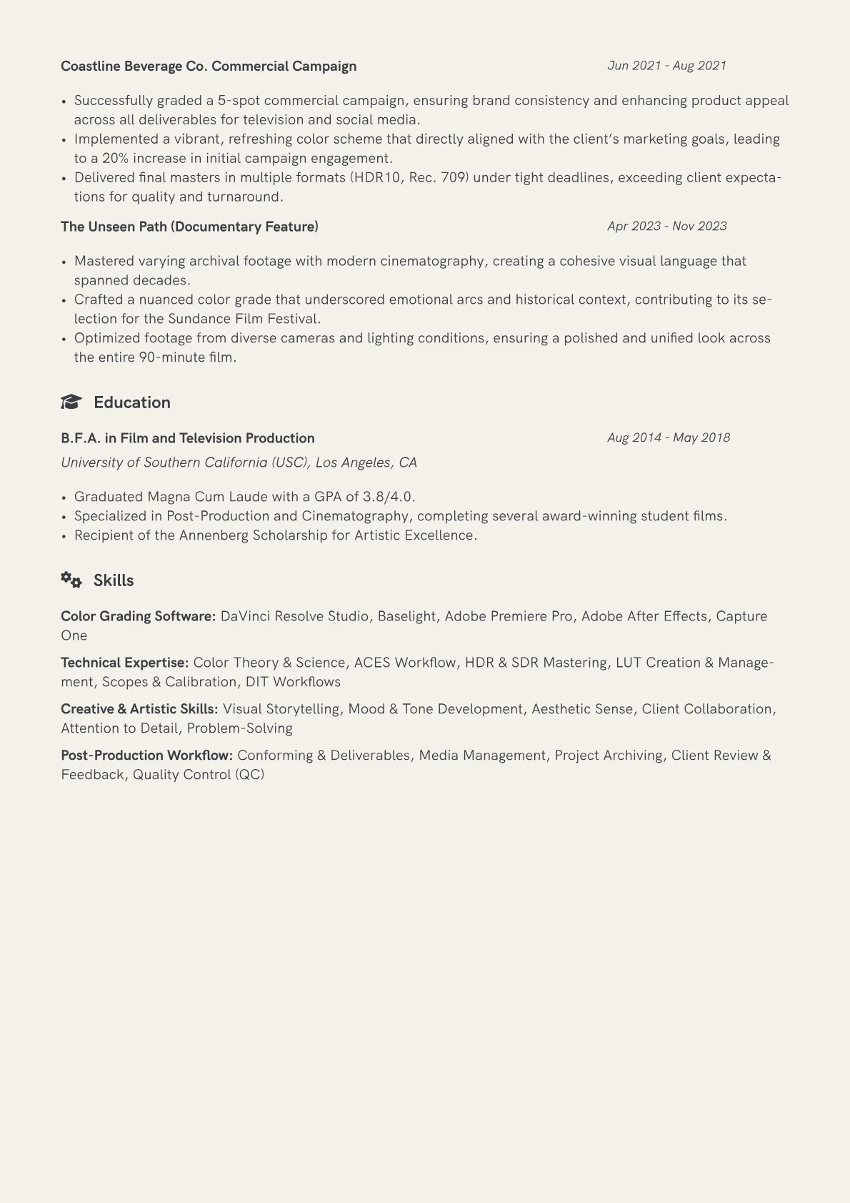 This template was built with JobSprout and can be remixed to create your own tailored Color Grading Artist resume. It provides an excellent framework for presenting your specialized expertise effectively.