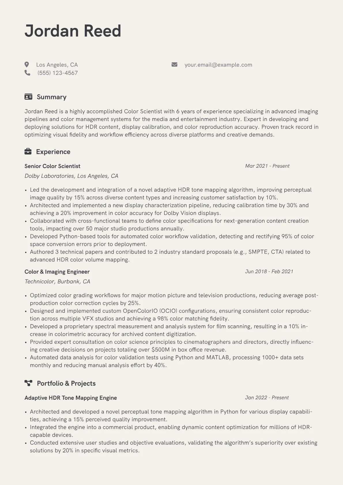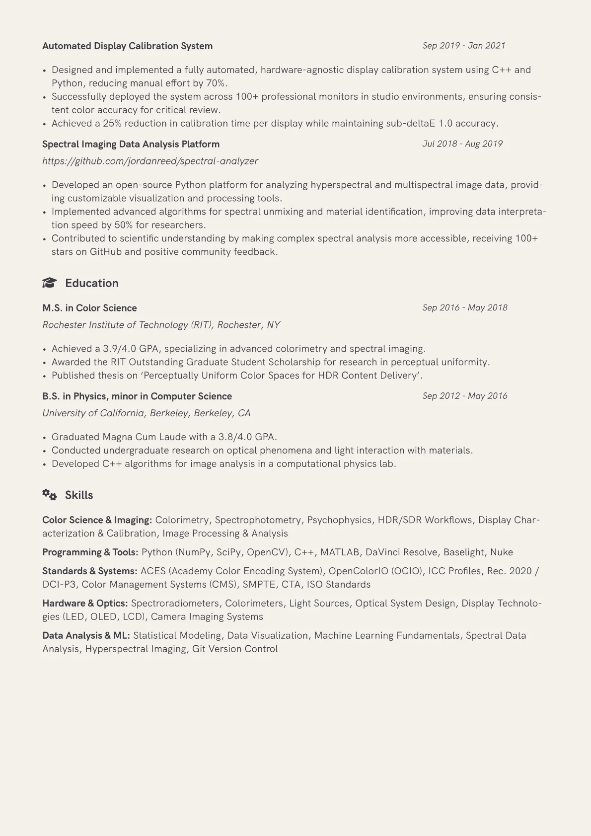 This example CV excels by structuring its content to emphasize both scientific rigor and design application. Achievements are quantified effectively, showing impact such as "Reduced color deviation by X% across Y projects" or "Implemented ACES pipeline for Z interactive experiences." Skills are thoughtfully grouped into categories like "Color Science & Management" (ACES, HDR, ICC, P3), "Design Tools" (Figma, Sketch, Adobe Creative Suite), and "Technical Software" (Resolve, Nuke). Crucially, relevant certifications and advanced tools are prominently highlighted, indicating a candidate’s practical readiness for demanding industry environments.