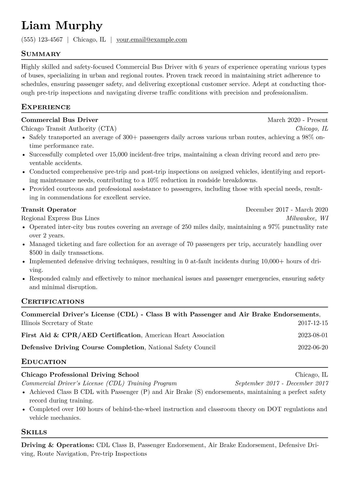 This robust template was built with JobSprout and offers a clear framework. Remix it today to create your own tailored Commercial Bus Driver resume that accelerates your job search.