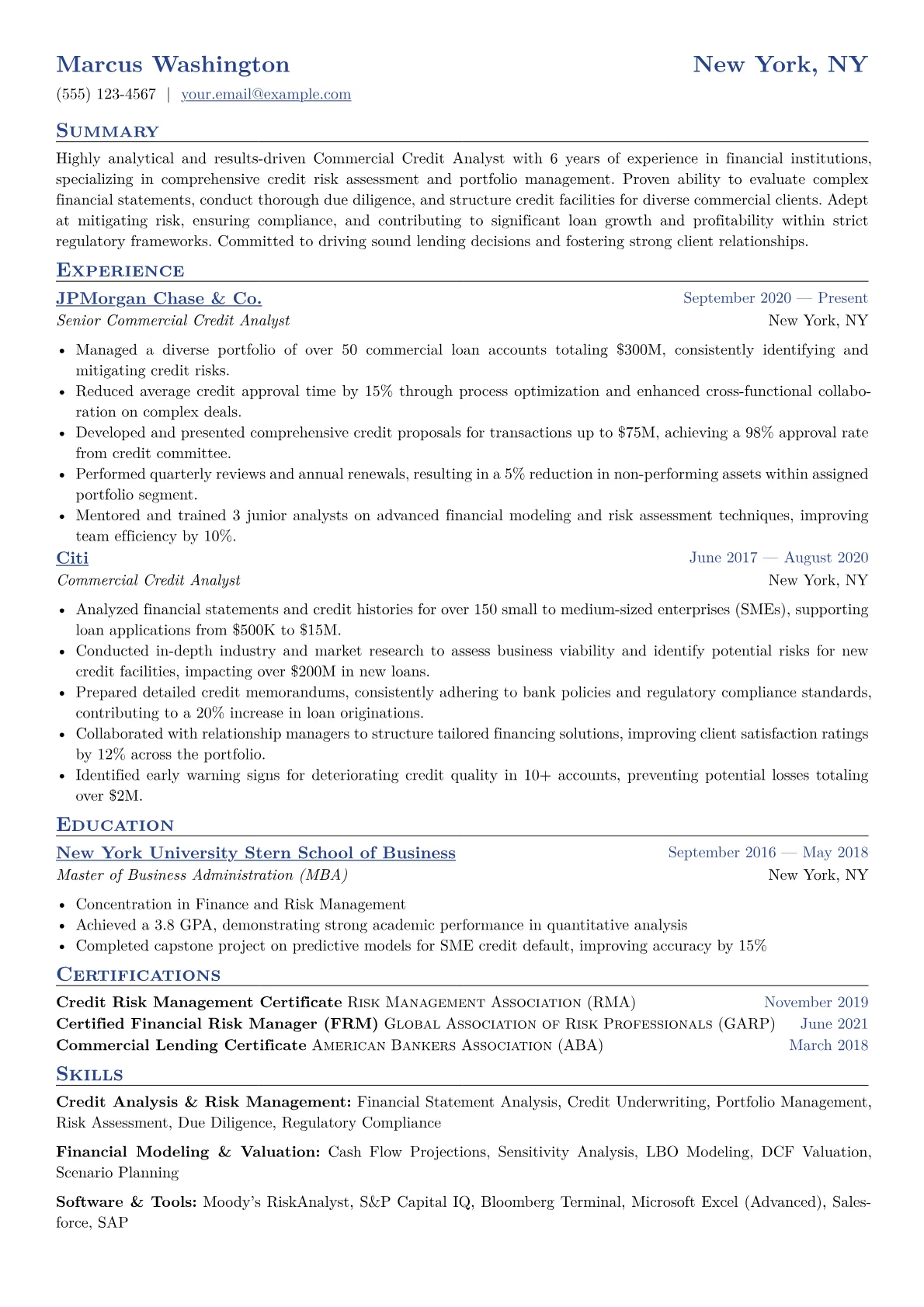 For a Commercial Credit Analyst with 3-7 years of experience in Finance & Banking, a compelling resume articulates a precise understanding of credit risk and financial due diligence. Hiring managers seek demonstrated expertise in covenant analysis, financial modeling, and mitigating portfolio risk. It is crucial to highlight contributions to loan portfolio health, proficiency in analyzing complex financial statements, and adherence to regulatory frameworks. Concrete achievements might include reducing default rates, improving credit decision turnaround times, or successful underwriting of large commercial loans. Key terminology like Debt Service Coverage Ratio (DSCR), Loan-to-Value (LTV), and EBITDA analysis should be evident.