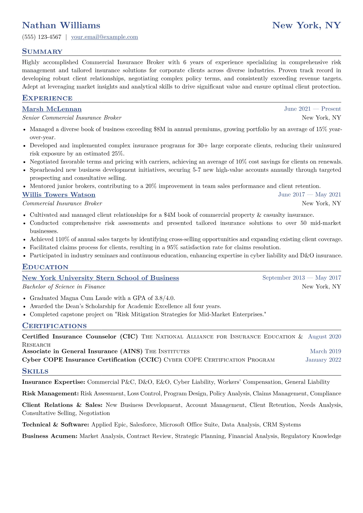 This example CV excels at showcasing these essential competencies. Its well-structured layout groups technical proficiencies like Applied Epic and Salesforce alongside crucial skills such as client advocacy and strategic negotiation. Achievements are precisely quantified, detailing successes like "secured $5M in new annual premiums" or "improved client retention by 15% through proactive risk reviews." The resume clearly distinguishes between market analysis capabilities and policy administration expertise, providing a comprehensive view. Industry-specific certifications are prominently featured, immediately communicating credibility and specialized knowledge vital for a competitive financial environment.