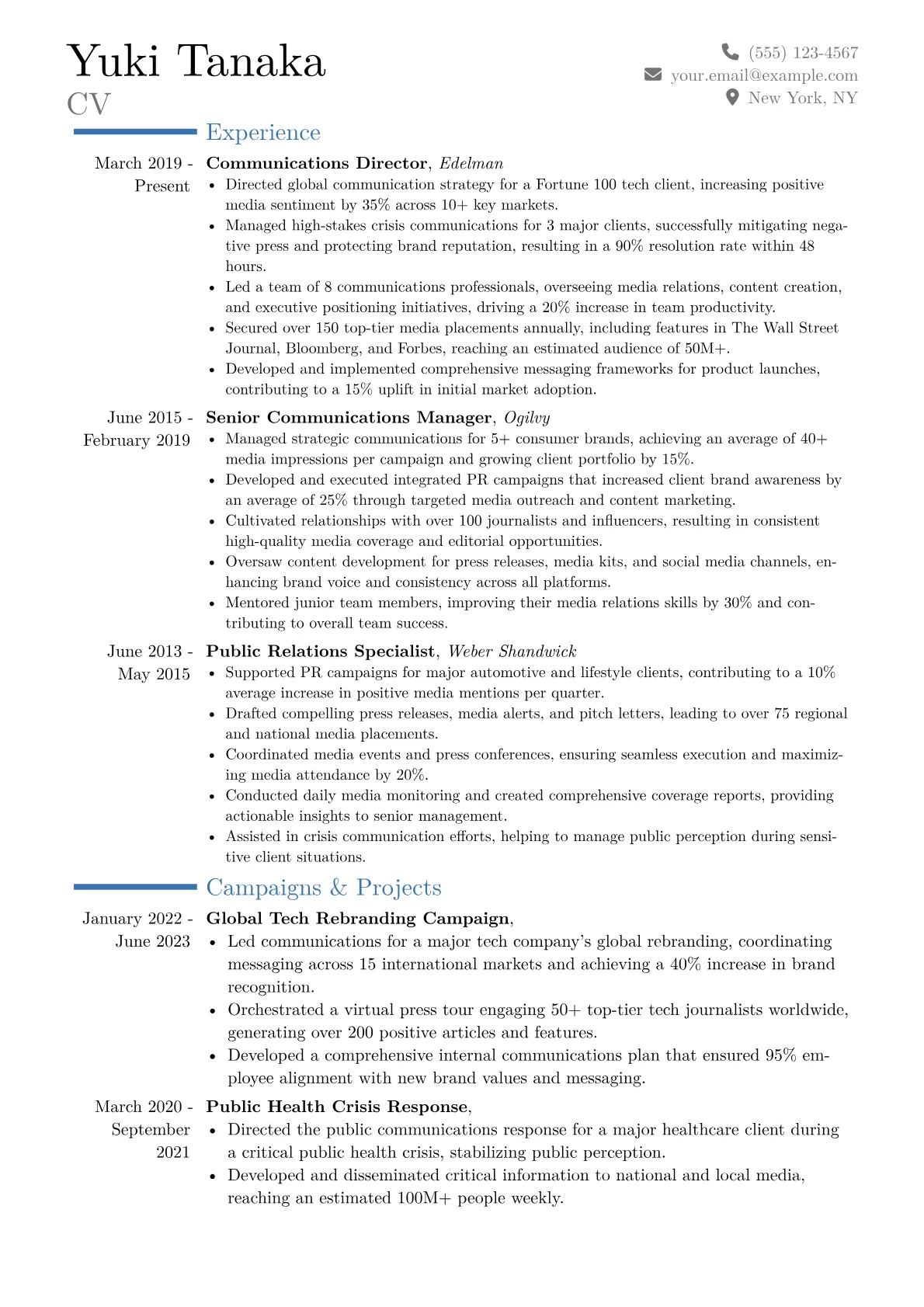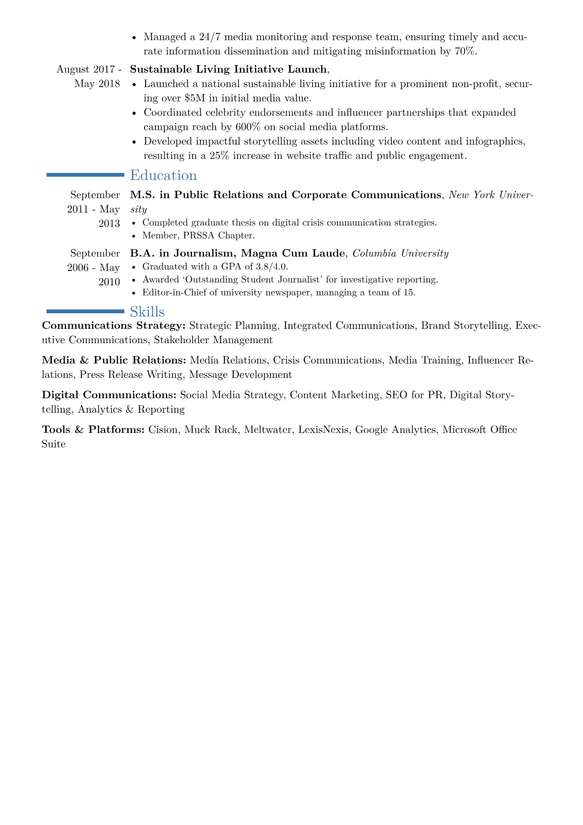 This JobSprout example effectively showcases these critical elements through its emphasis on quantified achievements, detailing specific increases in media mentions, brand engagement, or positive sentiment. The clear skills grouping, separating areas like "Strategic Communications," "Media Relations," and "Crisis Management," quickly highlights a comprehensive professional toolkit. Furthermore, the resume effectively articulates a progression of responsibilities, illustrating an upward trajectory in strategic influence.