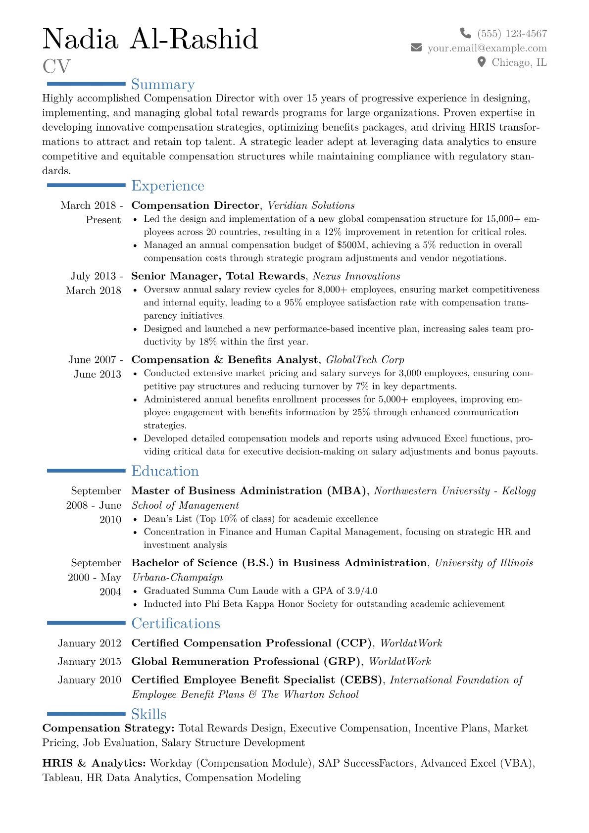 This example CV effectively showcases these critical elements. Achievements are quantified clearly, illustrating impacts such as "negotiated vendor contracts, saving $2M annually" or "developed new incentive plans, increasing employee retention by 15%." Strategic skills are thoughtfully grouped under headings like "Compensation Strategy and Design," "HRIS Implementation," and "Analytics and Reporting," providing immediate context. Specific tools and certifications, including CCP and proficiency in Workday HCM and advanced Excel modeling, are prominently featured, assuring hiring managers of immediate value. The structure highlights strategic contributions rather than just duties.