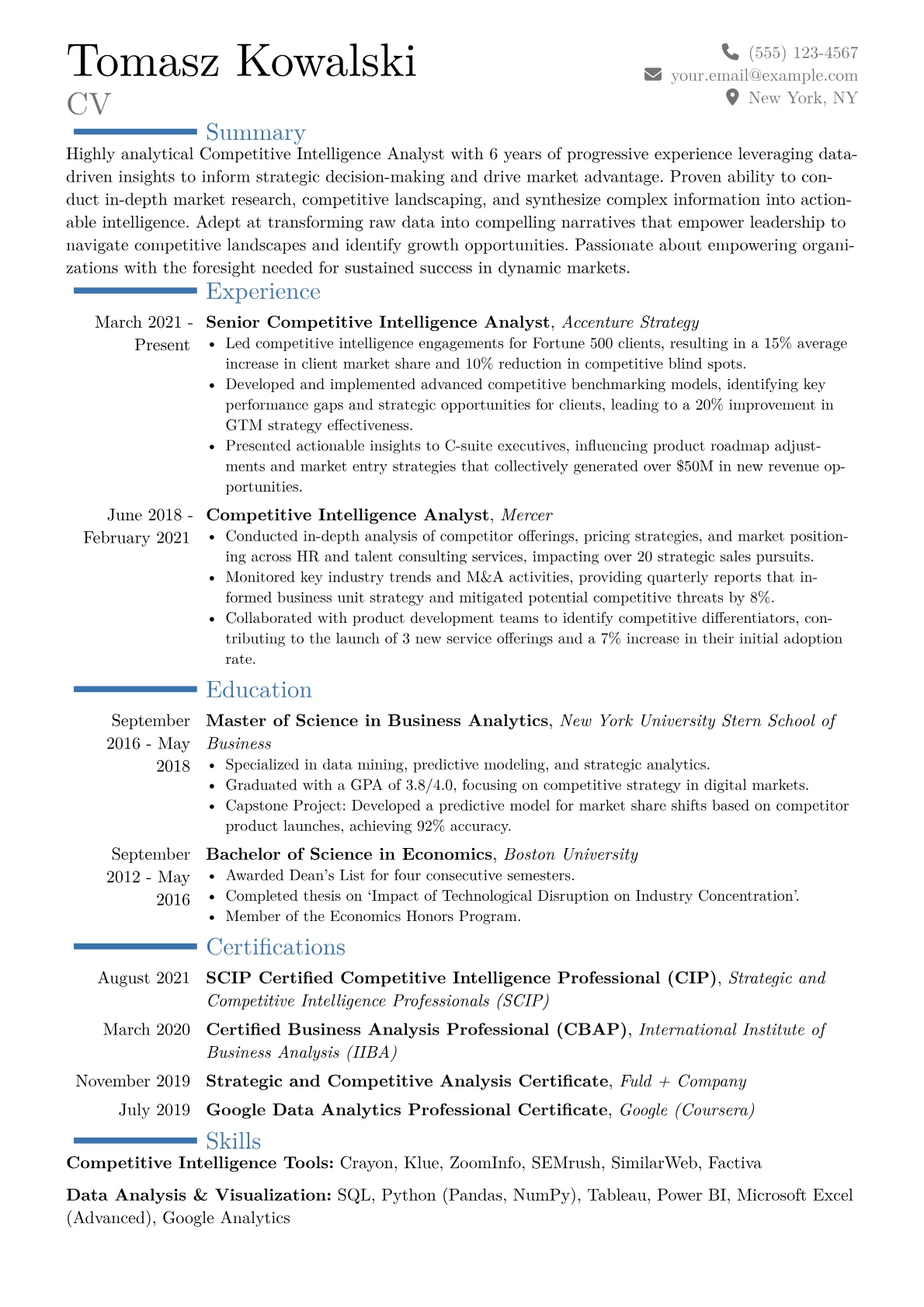 This example CV expertly structures its content to highlight these critical elements. Achievements are quantified precisely, illustrating the tangible value delivered, for instance, by linking competitor analysis to specific percentage improvements in client efficiency or revenue. Skills are thoughtfully grouped under categories such as "Strategic Analysis," "Data Visualization," and "Client Advisory," rather than a generic list, making the analyst’s diverse capabilities immediately apparent. Furthermore, the resume prominently features proficiency with industry-standard tools like specific CRM systems, market intelligence platforms, and data visualization software, assuring recruiters of immediate technical readiness.