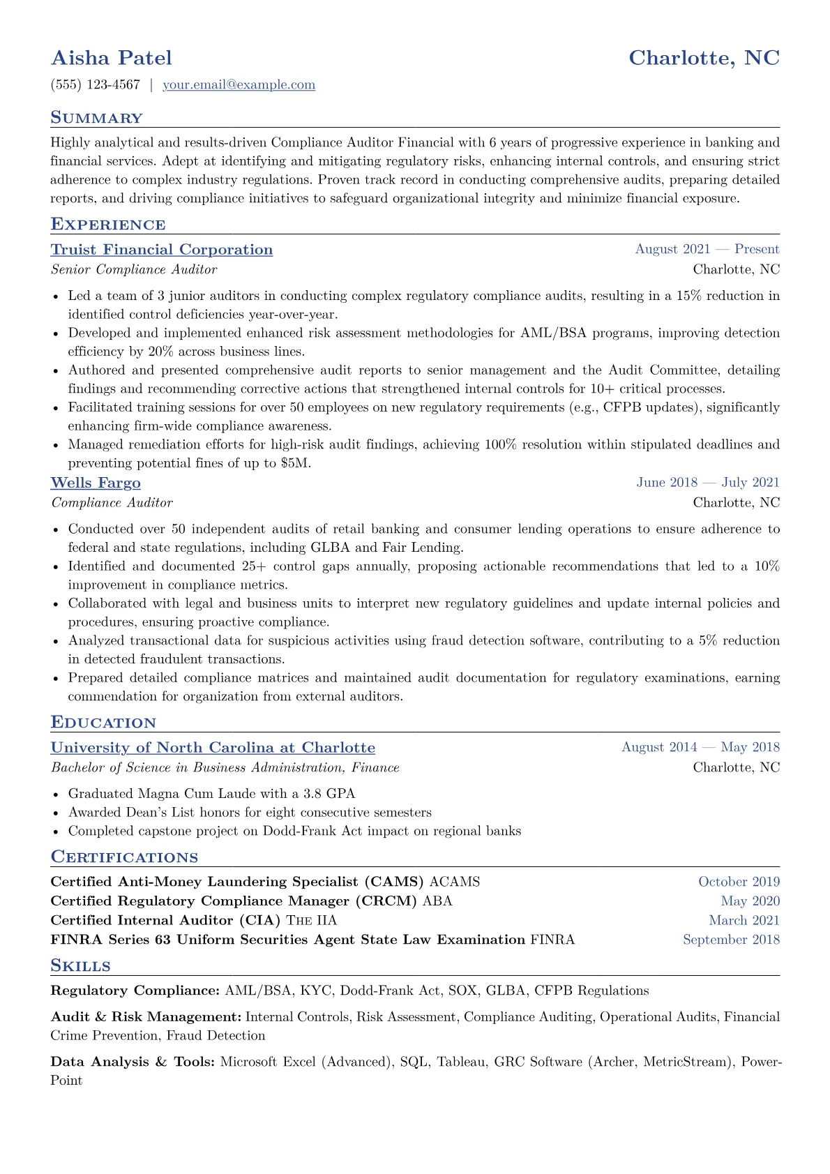This template was built with JobSprout and can be remixed to create your own tailored Compliance Auditor Financial resume.