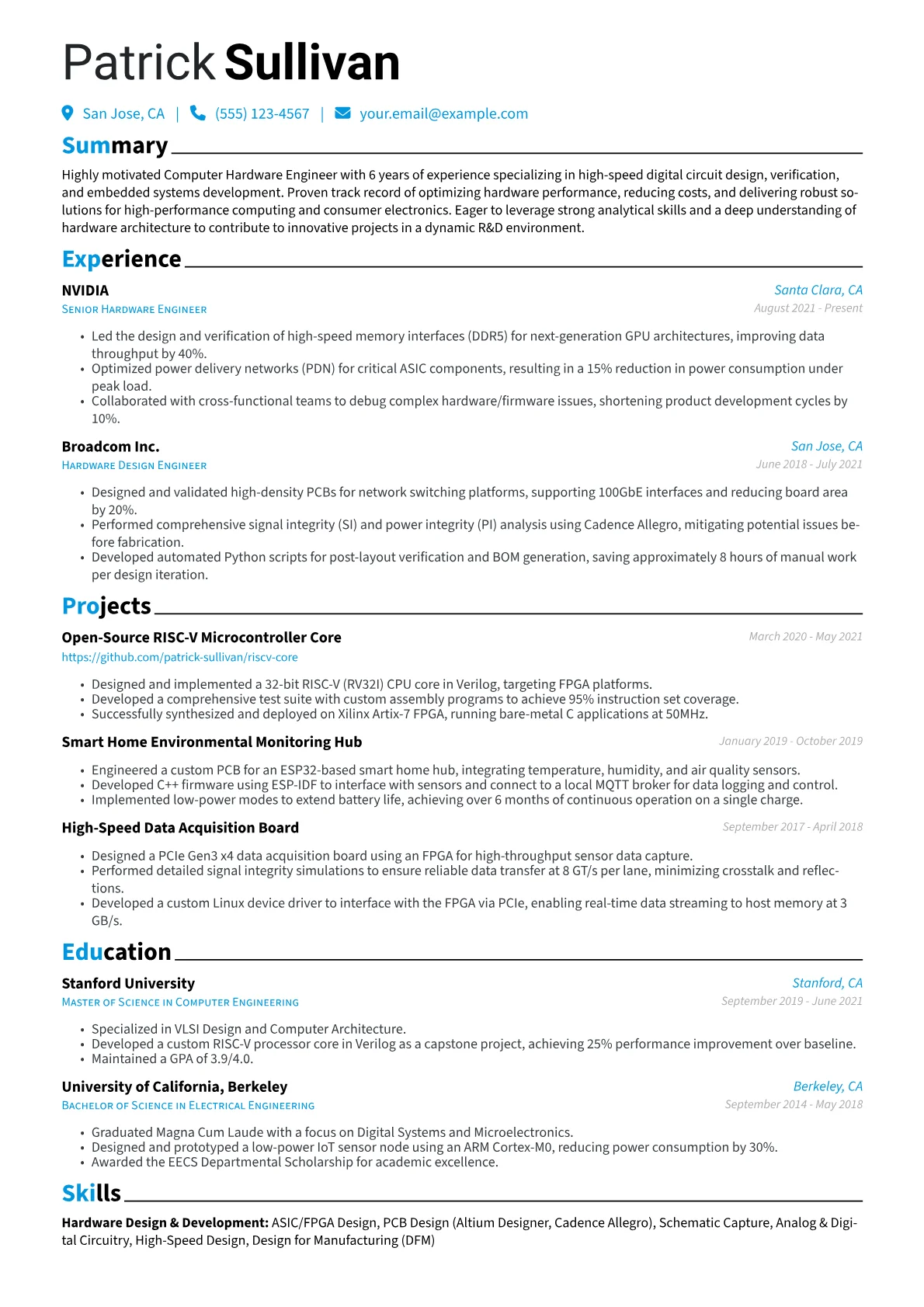 This template was built with JobSprout and can be remixed to create your own tailored Computer Hardware Engineer resume, emphasizing your unique qualifications and accomplishments.