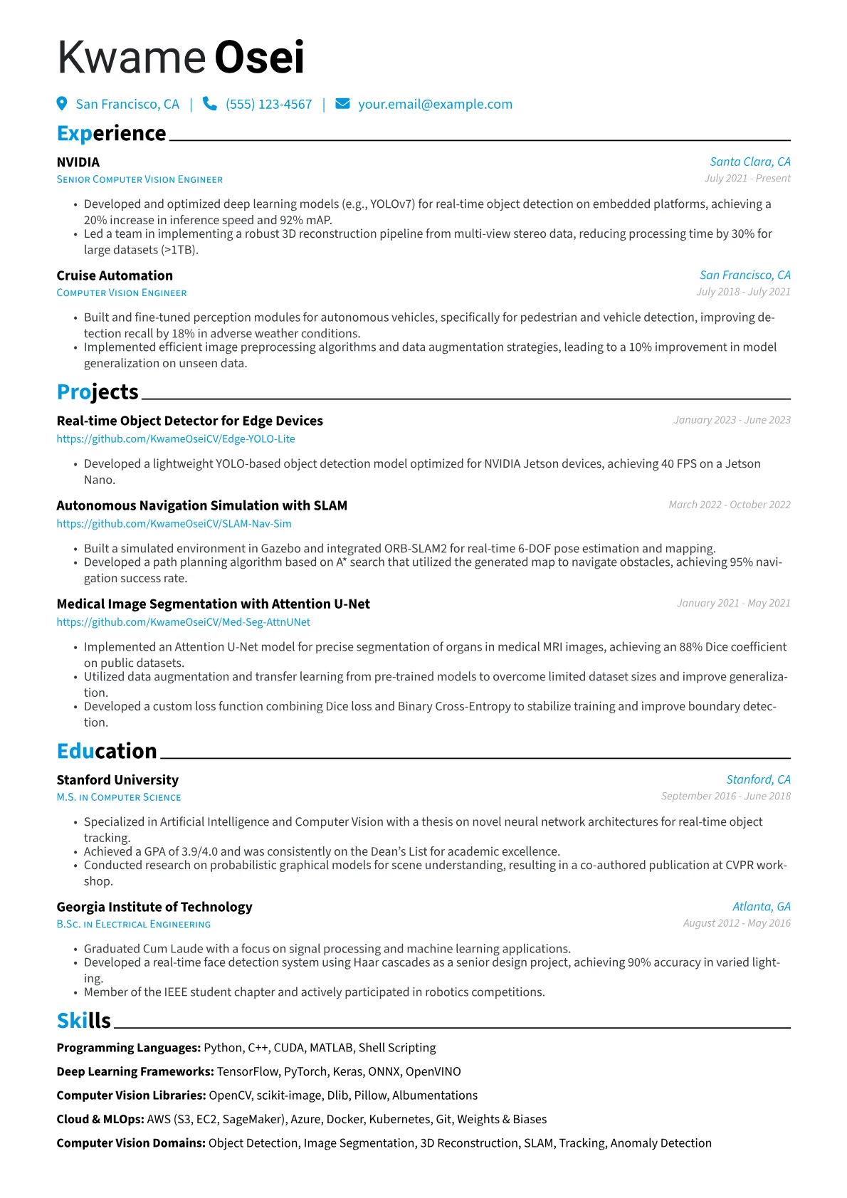 This example excels by prioritizing quantified achievements, such as "optimized model performance by 15%," directly illustrating business value. Its clear skills grouping, separating programming languages from specialized libraries like OpenCV and TensorFlow, provides hiring managers with an immediate snapshot of technical proficiency. The inclusion of relevant projects further highlights practical application and problem-solving.