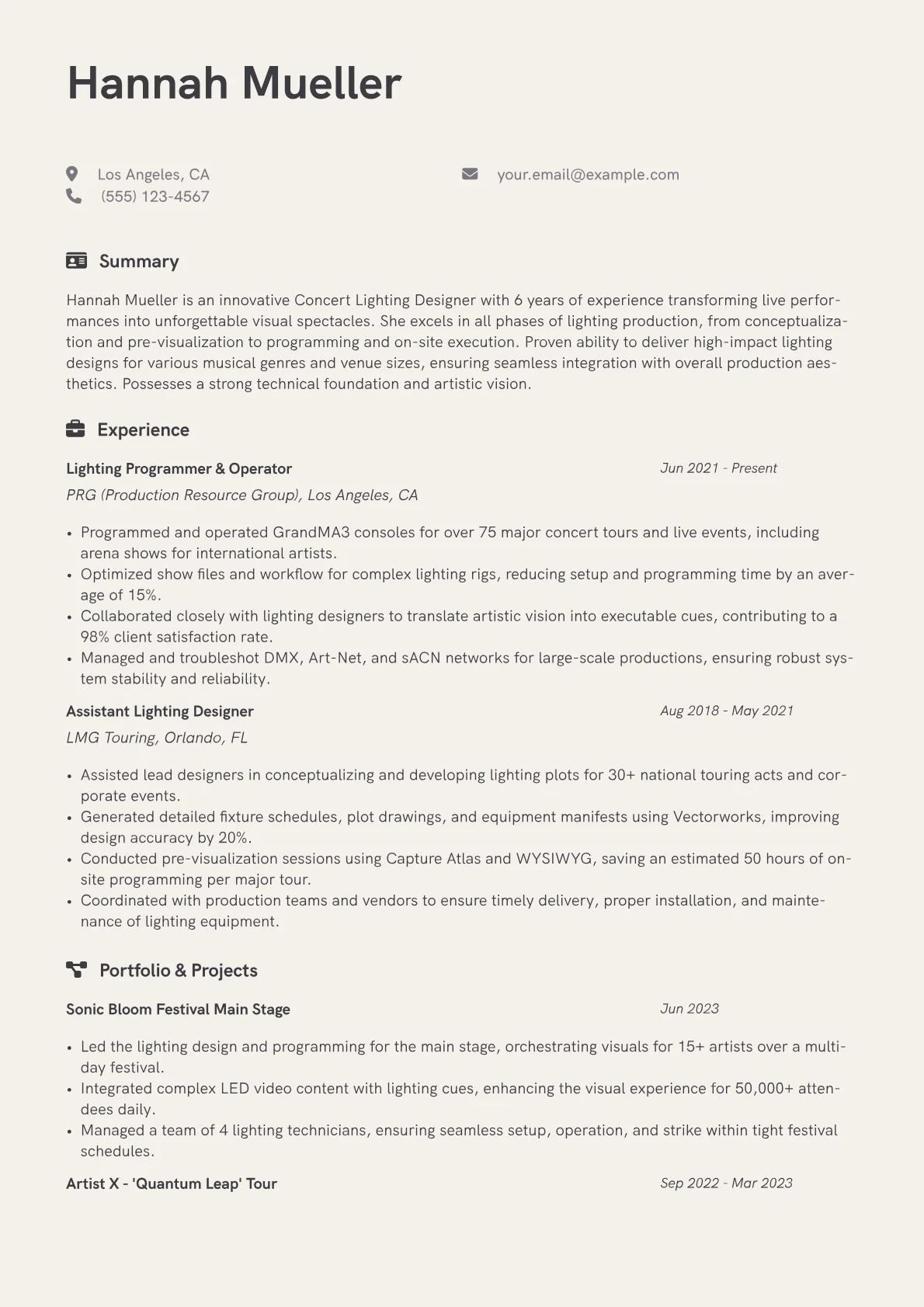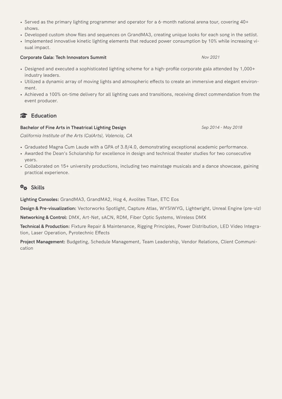 This example CV excels by structuring content to immediately highlight these essential competencies. Quantified achievements clearly state the scale and success of past projects, for instance, "Programmed intricate lighting for 20+ national tours, enhancing visual storytelling for over 100,000 concertgoers annually." Skills are thoughtfully grouped by category—consoles, software, networking—providing a quick overview of technical breadth. Crucially, certifications and a link to a professional portfolio or showreel are prominently featured, offering immediate validation of expertise and a direct path to viewing their creative output.
