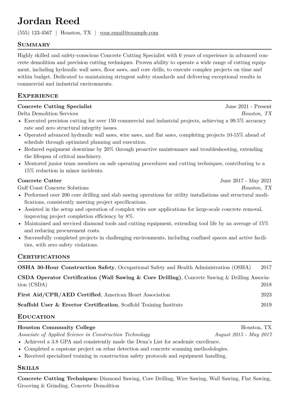 This template was built with JobSprout and can be remixed to create your own tailored Concrete Cutting Specialist resume, ensuring you highlight your unique skills and accomplishments effectively.