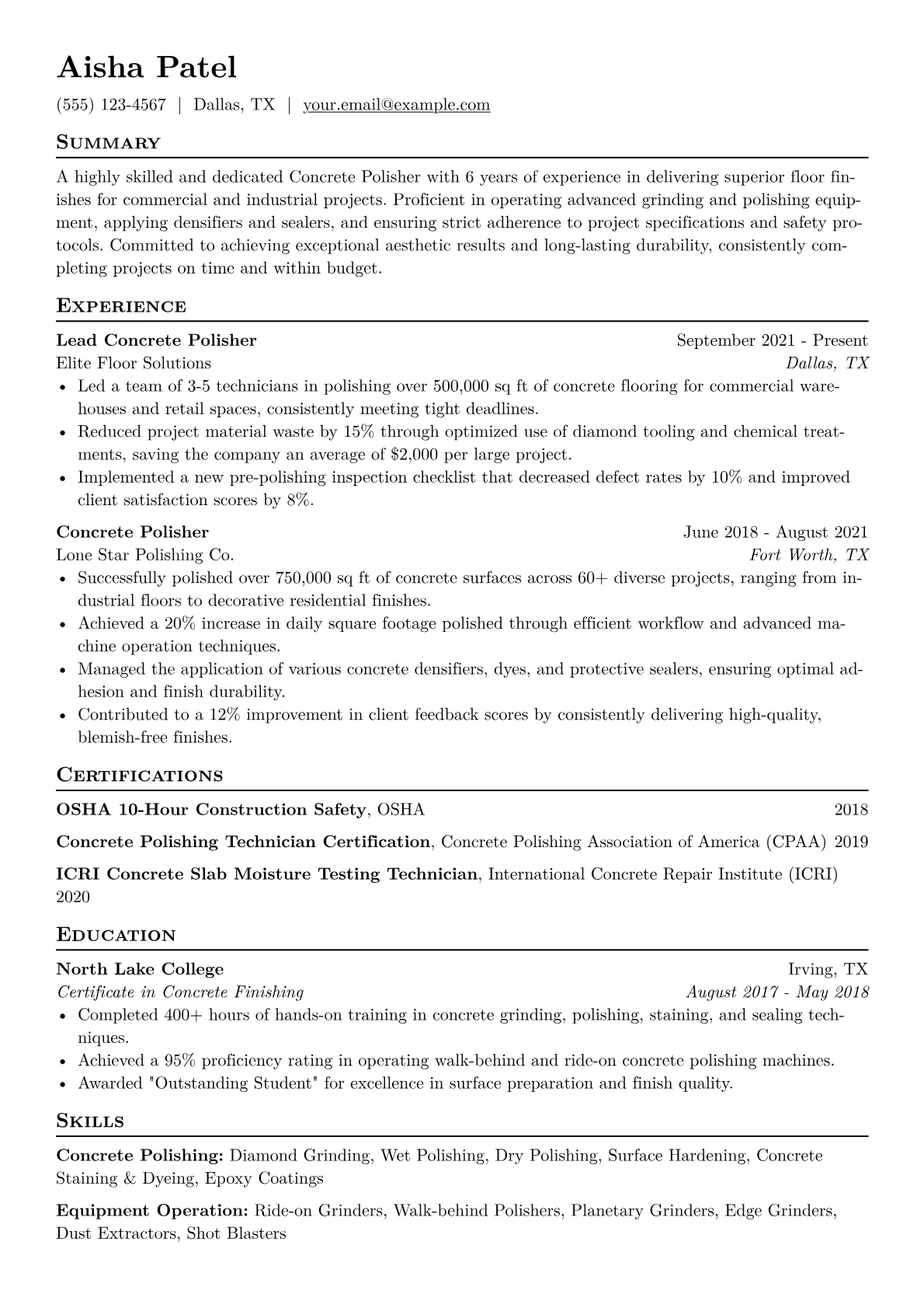 This template was built with JobSprout and can be remixed to create your own tailored Concrete Polisher resume.