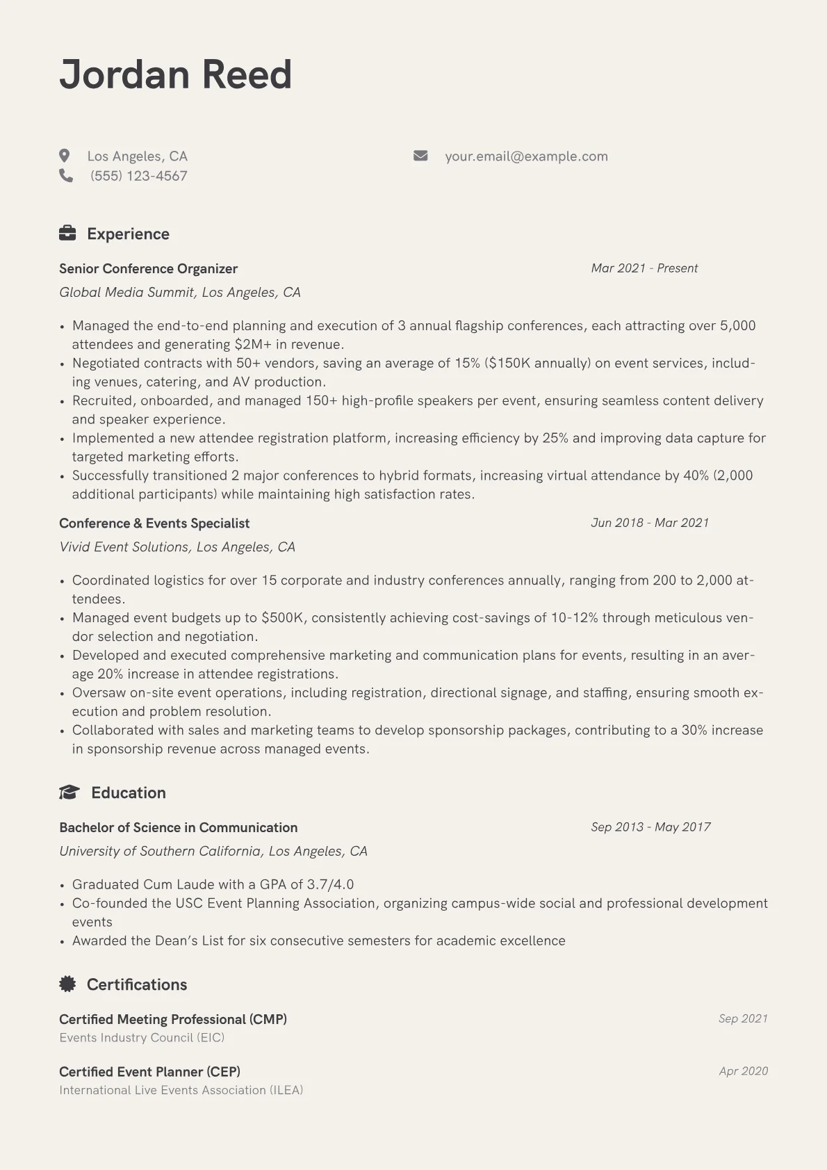 A strong Conference Organizer resume in Media & Entertainment prioritizes a proven ability to manage complex logistics, negotiate vendors, and oversee budgets for impactful events. Hiring managers seek candidates who can meticulously plan and execute, translating creative visions into seamless attendee experiences within the industry's fast-paced, high-stakes environment. Success hinges on demonstrating both operational excellence and an understanding of audience engagement.