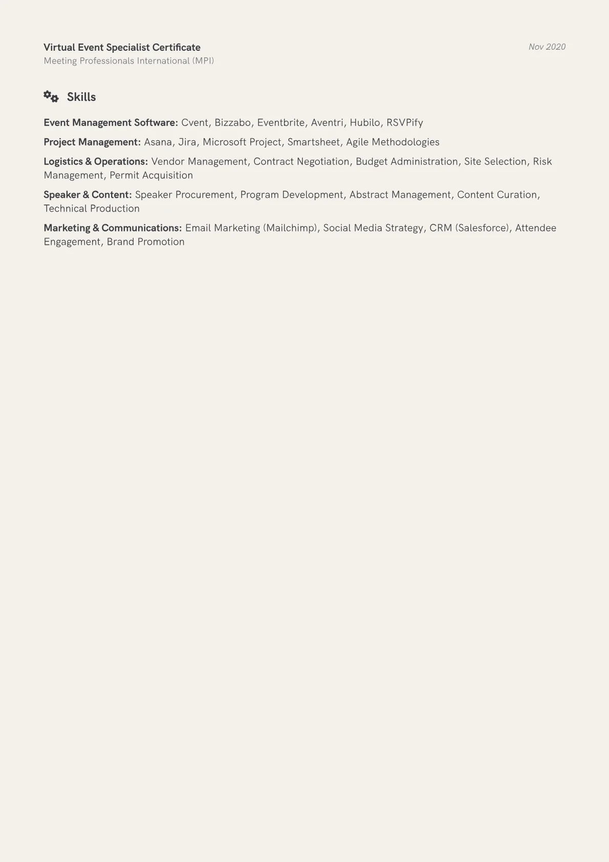 This JobSprout example excels by showcasing quantified achievements that clearly detail event successes, such as increased attendance or sponsor revenue. Its strategic skills grouping highlights relevant event technology, project management software, and industry-specific tools crucial for the modern M&E landscape. This structure effectively communicates a candidate's practical capabilities and impact.