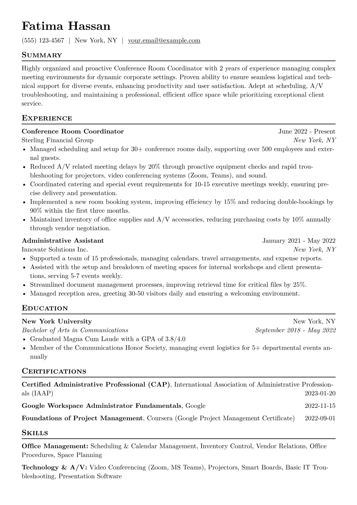 This template was built with JobSprout and can be remixed to create your own tailored Conference Room Coordinator resume.
