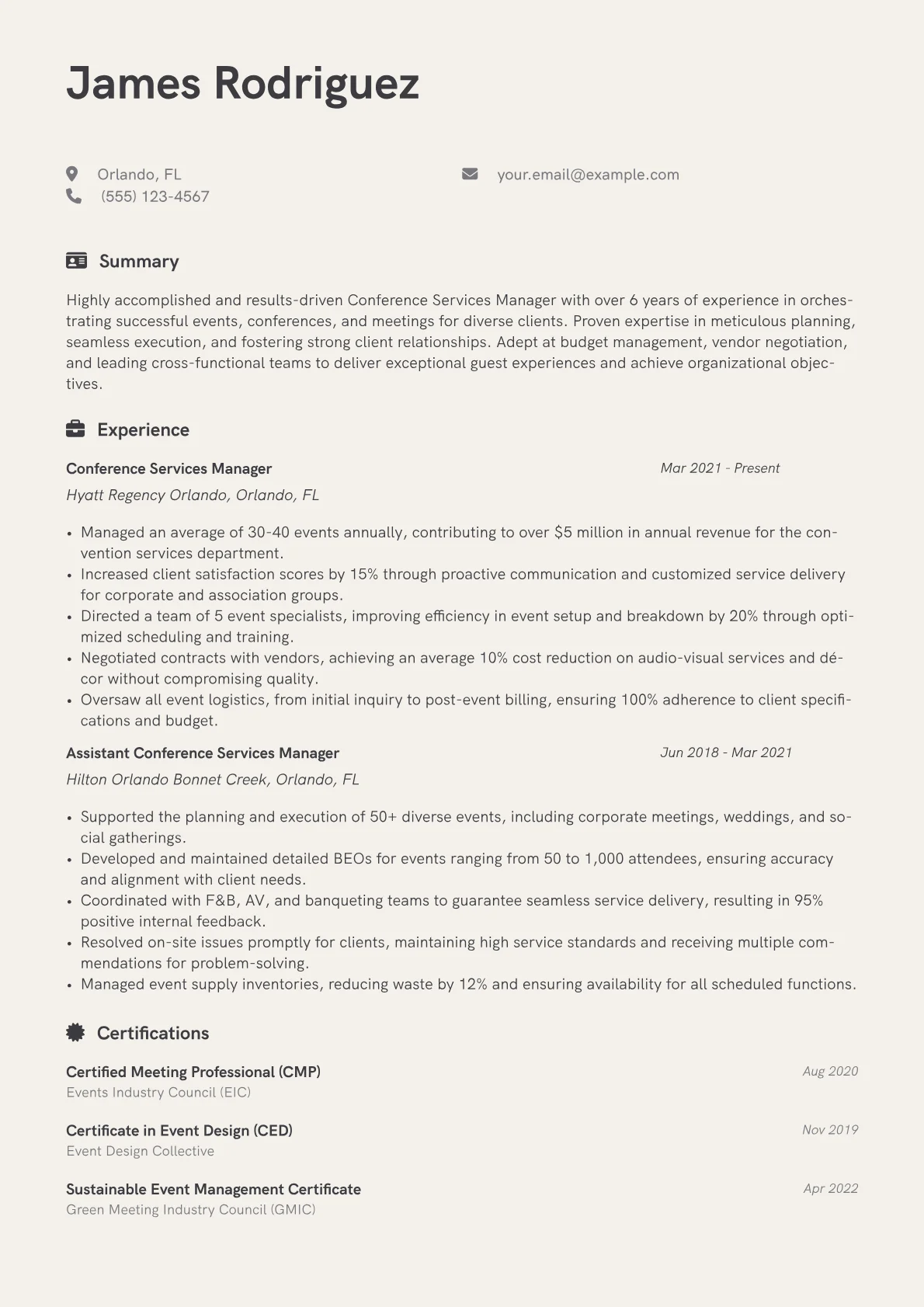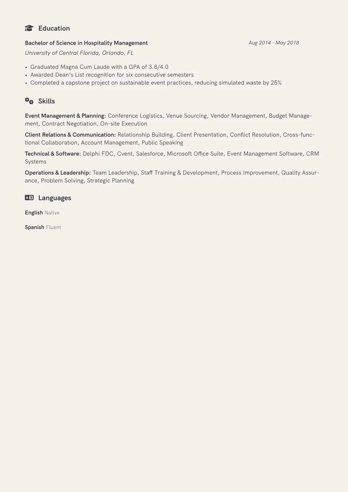 This example CV excels by quantifiably presenting achievements, such as overseeing specific numbers of events or managing budgets of a certain scale. Skills are thoughtfully grouped into relevant categories, like "Event Logistics and Planning," "Vendor Management," and "Client Relations," making key competencies immediately apparent. Crucially, the resume highlights industry-specific tools and certifications, showing practical proficiency and a commitment to professional development. This structural clarity allows recruiters to quickly identify a candidate’s capacity for complex project management and client advocacy.