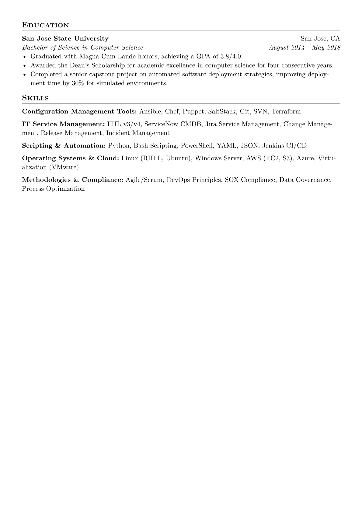 This example excels by prioritizing quantified achievements, such as specific reductions in deployment time or improvements in system reliability. It strategically groups relevant certifications like ITIL or vendor-specific proficiencies, alongside a comprehensive skills section detailing tools like SCCM, Ansible, and scripting languages. This structure clearly communicates a candidate's proven ability to manage intricate configurations and drive continuous improvement.