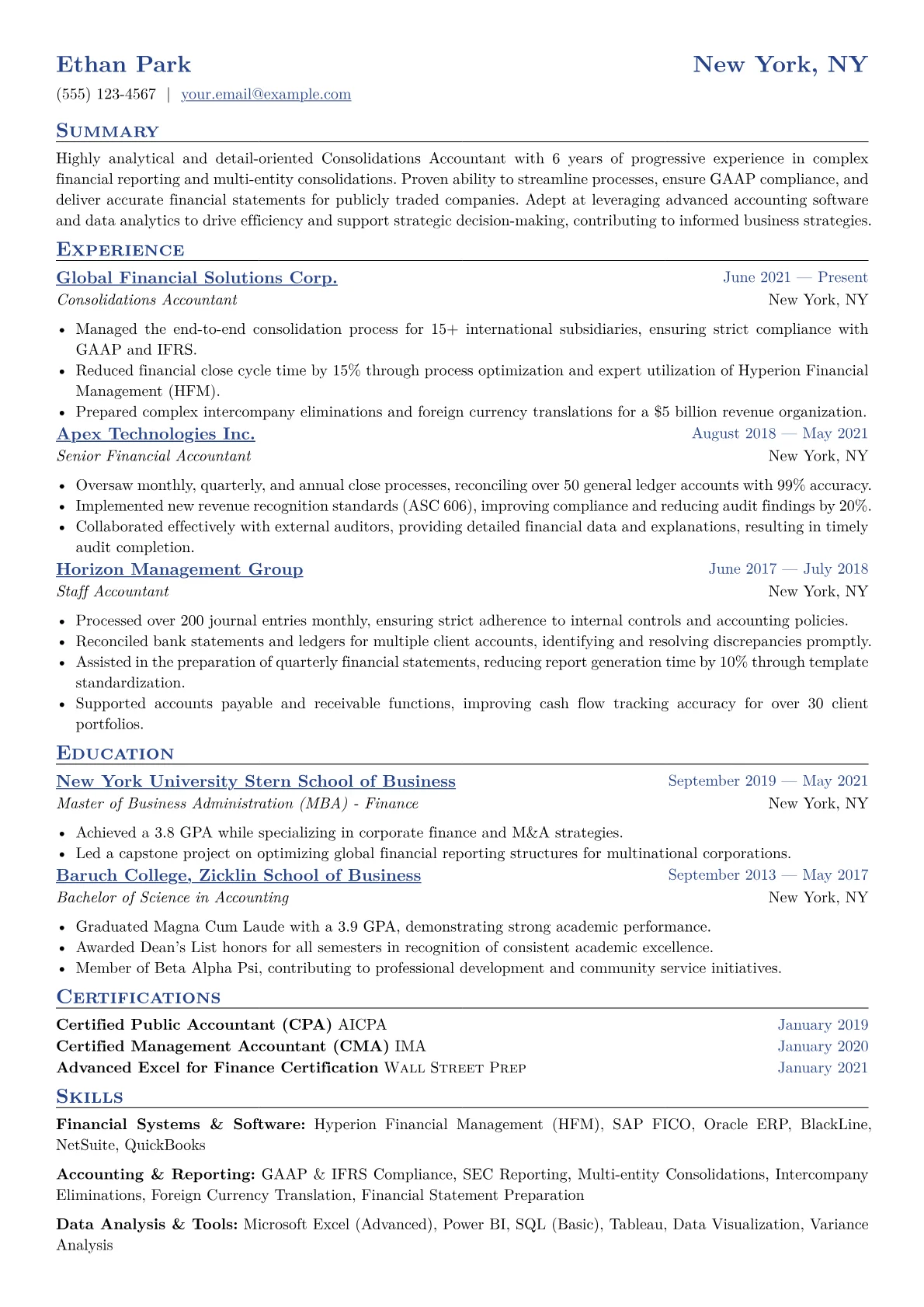 The provided example CV effectively highlights these critical elements. Achievements are quantified, detailing contributions like reducing the consolidation close time by 20% or managing reporting for 15 international subsidiaries. Technical skills are prominently grouped, featuring specific proficiencies in HFM, SAP BPC, and advanced Excel modeling, which are essential for the role. The resume also strategically positions the CPA certification and relevant software expertise early, immediately signaling key competencies to recruiters.