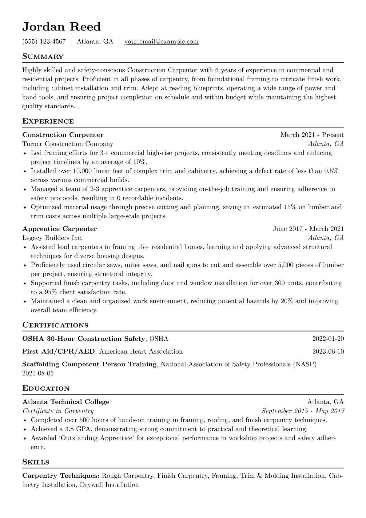 For a Construction Carpenter aiming for mid-level roles in Manufacturing, a resume must highlight specific, quantifiable achievements. Hiring managers prioritize candidates who demonstrate a meticulous approach to blueprint interpretation, maintain tight tolerances, and contribute to efficient production flows. Key elements include experience with specialized machinery, knowledge of lean manufacturing principles, and a strong safety record, often evidenced by certifications like OSHA 10 or 30, and Scaffold User qualifications. Detailing contributions to waste reduction or meeting stringent quality control standards is also crucial.