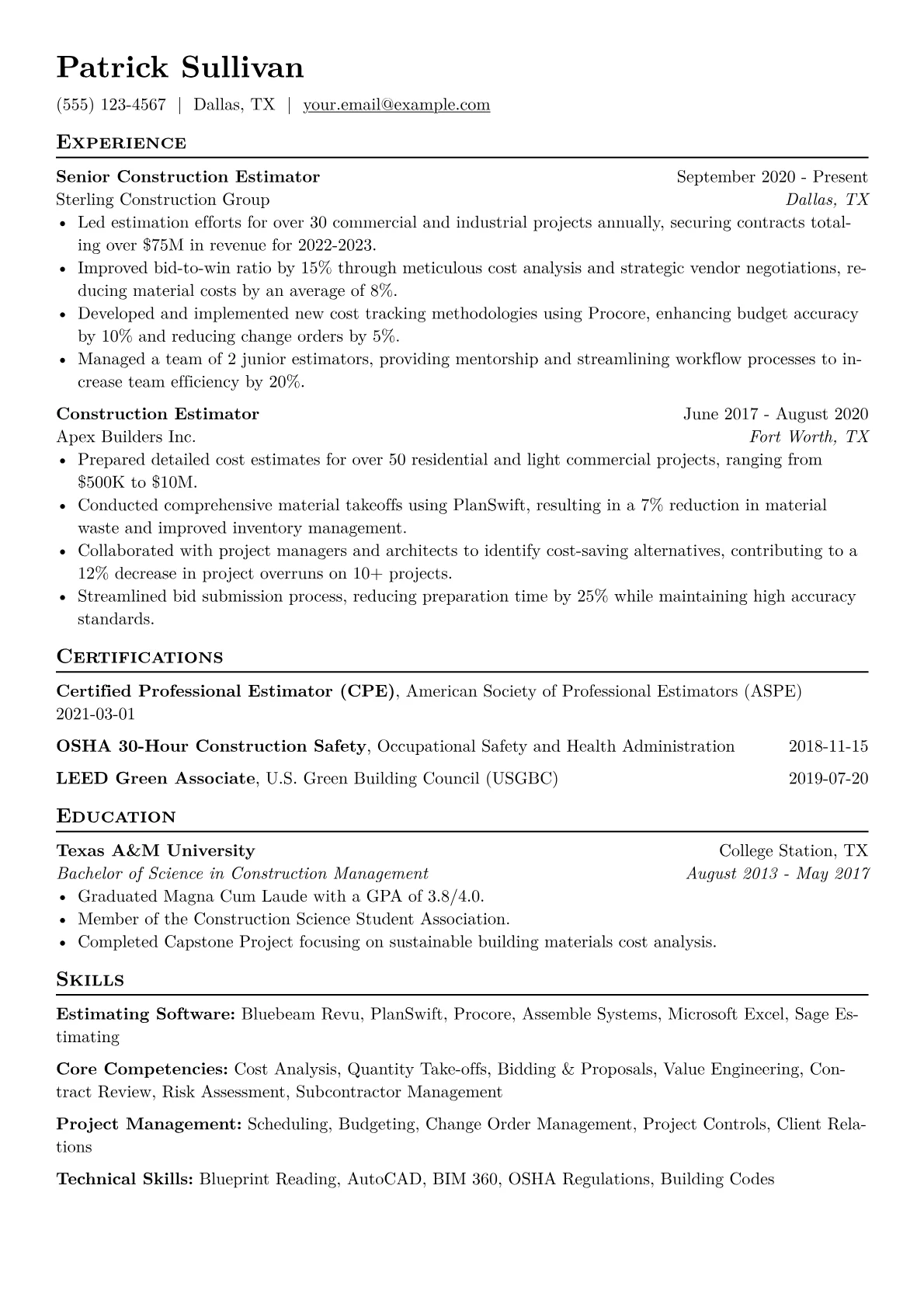 For a Construction Estimator in manufacturing, a standout resume demonstrates a precise grasp of cost projection, material sourcing, and efficient project execution. Hiring managers seek professionals who can accurately budget for specialized equipment, production line integration, and facility expansions, all while navigating complex supply chains unique to manufacturing. The key challenge lies in balancing strict budgetary controls with operational efficiency and regulatory compliance.