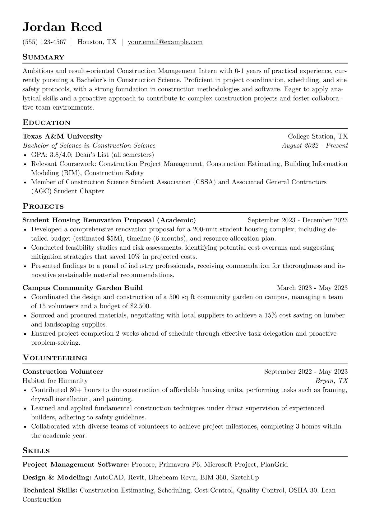 This template was built with JobSprout and can be remixed to create your own tailored Construction Management Intern resume.