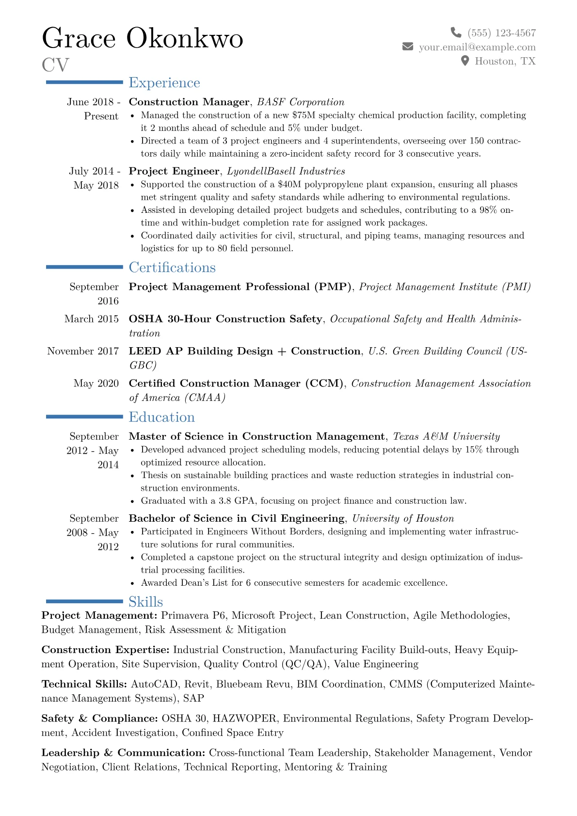 This example resume excels by highlighting quantified achievements that directly address these needs, such as "Reduced project timelines by 15% through optimized resource allocation." Its dedicated "Certifications" section prominently features relevant qualifications like PMP or OSHA 30, while the "Skills" grouping clearly distinguishes between technical proficiencies and leadership capabilities crucial for site management and vendor coordination.