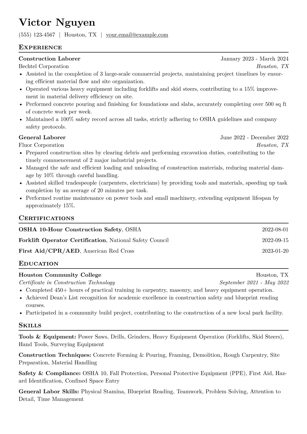 A strong Construction Worker resume, especially for manufacturing roles, needs to emphasize safety compliance, practical hands-on skills, and reliability. Hiring managers in manufacturing look for candidates who understand plant environments, can operate specific machinery, and contribute to maintaining operational infrastructure. The unique challenge for entry-level candidates is effectively showcasing their work ethic and foundational knowledge without extensive prior roles.