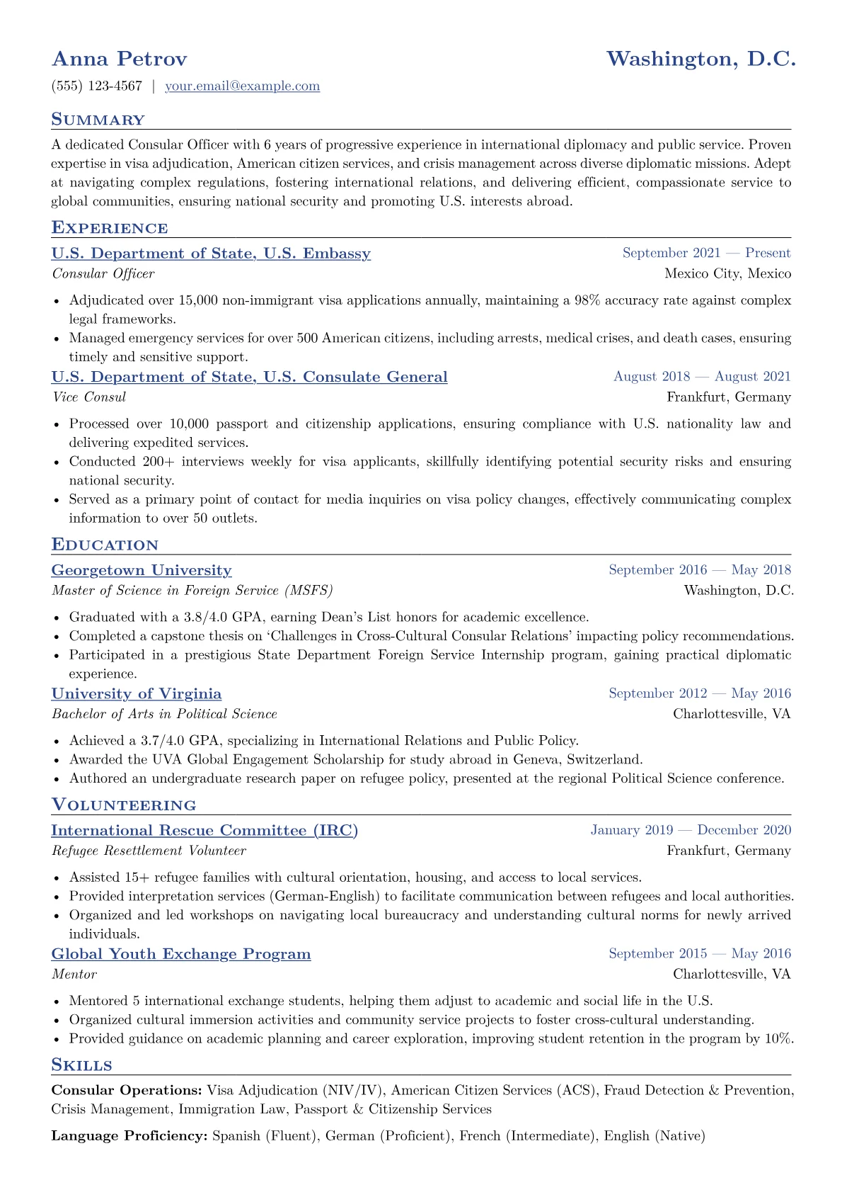A Consular Officer resume in government demands precision in demonstrating adherence to complex regulations and providing critical services under pressure. Hiring managers specifically look for experience with visa adjudication, passport services, and emergency citizen assistance, often involving high-stakes decisions and diverse populations. Key achievements should detail successful management of high-volume caseloads, accurate application of USCIS and DOS policies, and effective resolution of complex issues like citizenship determinations or prisoner welfare cases. Foreign language proficiency, relevant FSI training, and a security clearance are invaluable credentials.