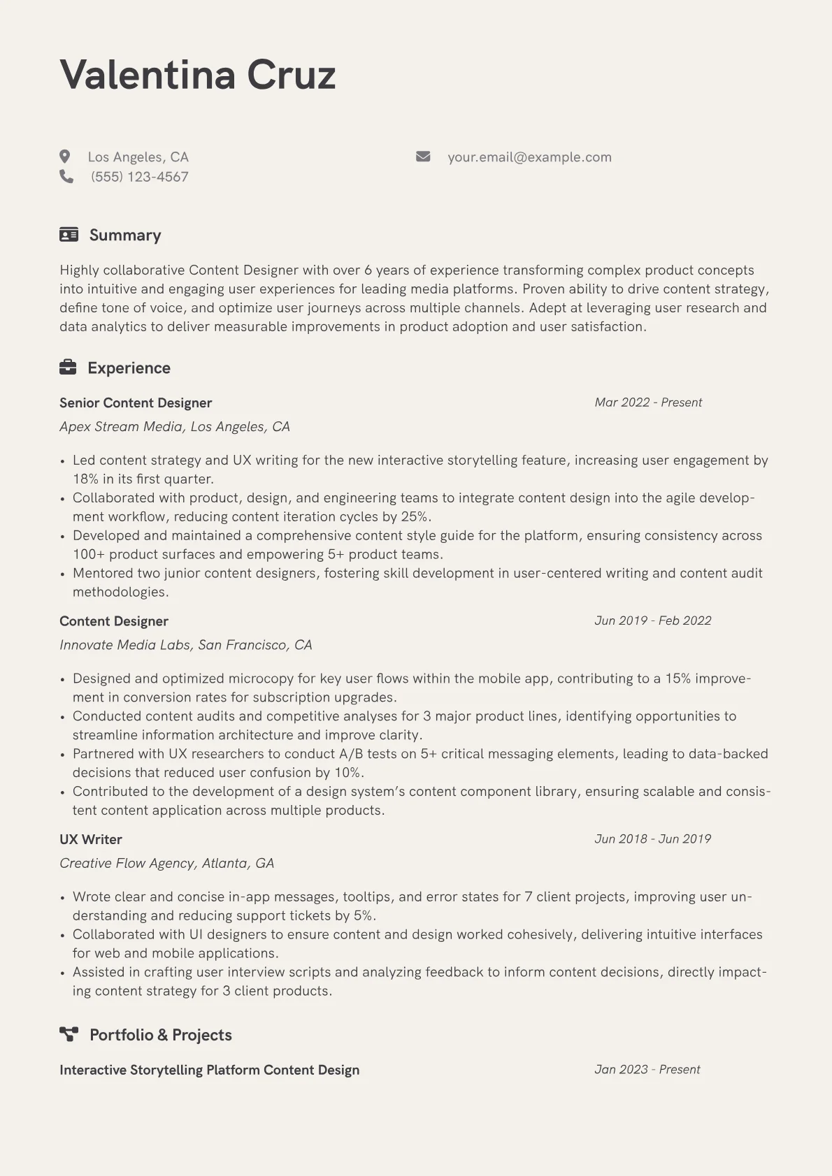 This template was built with JobSprout and can be remixed to create your own tailored Content Designer resume, ensuring your unique experience shines.