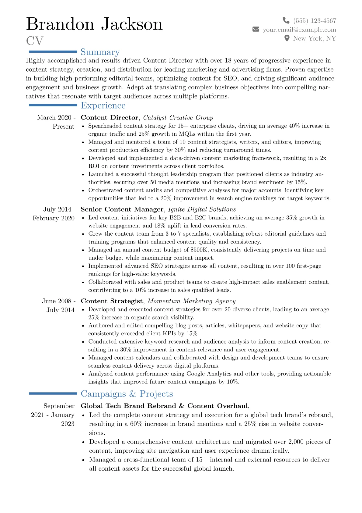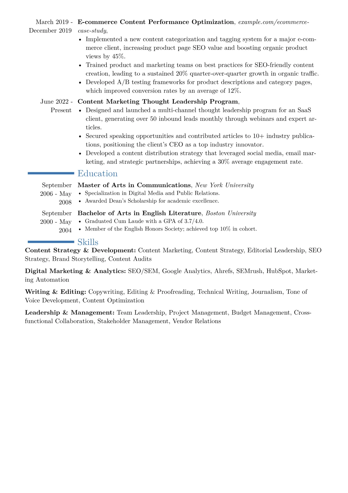 This Content Director example resume excels by strategically quantifying achievements within each role, demonstrating how content initiatives directly influenced business outcomes. It clearly groups specialized skills under categories like "Content Strategy & SEO," "Team Leadership & Editorial Management," and "Analytics & Optimization," making it easy for recruiters to grasp the candidate's breadth of expertise. Key certifications and industry-standard tools, such as HubSpot Content Marketing or advanced analytics platforms, are prominently highlighted, underscoring both technical proficiency and a commitment to data-driven content decisions.