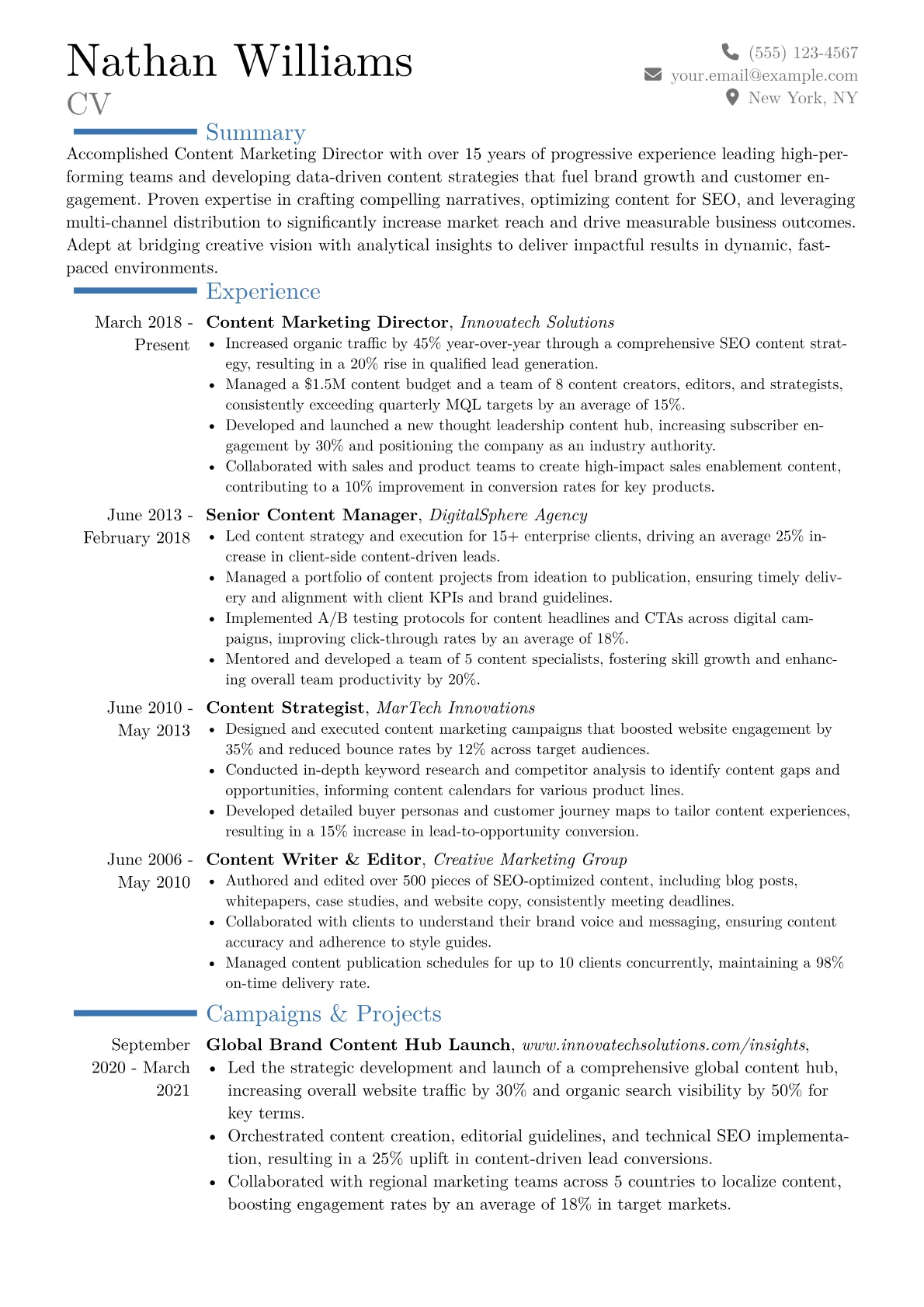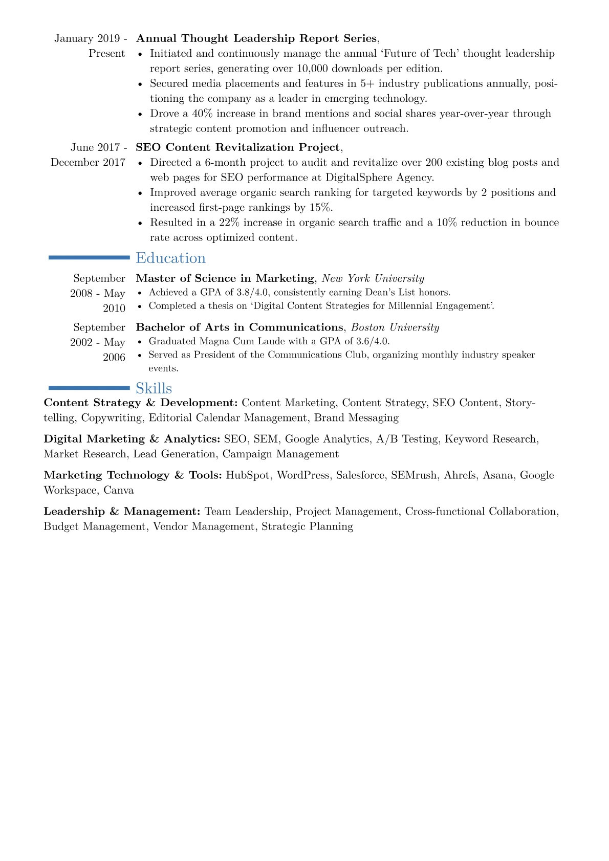 This example CV excels by foregrounding these executive-level contributions. Achievements are powerfully quantified, detailing the specific results generated, such as "increased MQLs by 35% through optimized content funnels" or "managed a $X million content budget across five brands." Skills are intelligently grouped, separating strategic capabilities like "Content Strategy & Roadmapping" from technical proficiencies such as "Ahrefs, SEMrush, WordPress." Key certifications, for example, "HubSpot Content Marketing Certified," are prominently featured alongside specific content and SEO tools, signaling a command of the contemporary content landscape.