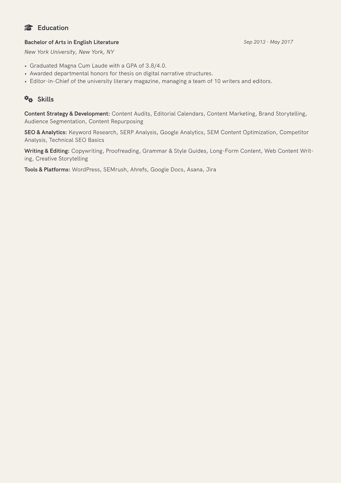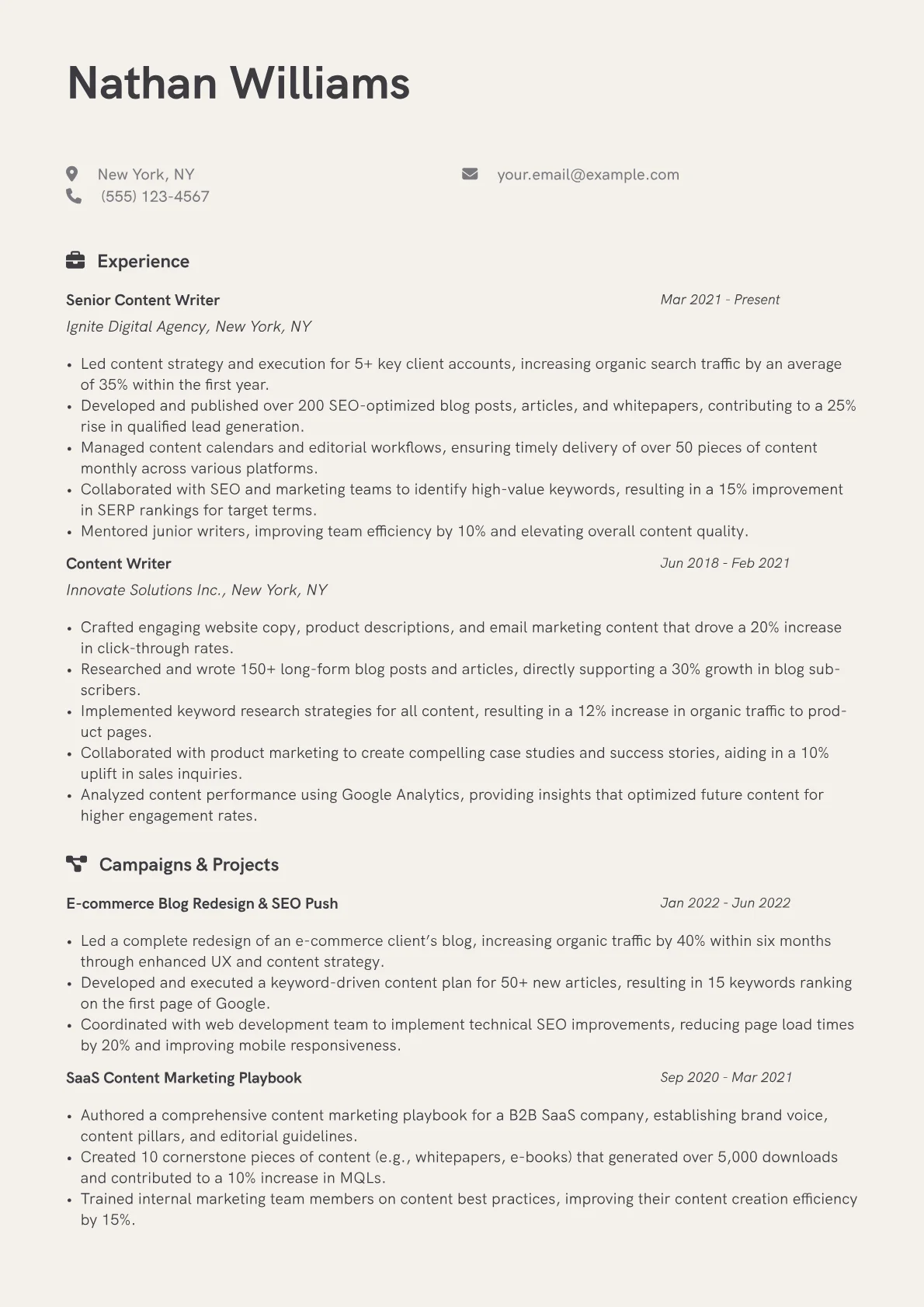 This template was built with JobSprout and can be remixed to create your own tailored Content Writer resume, ensuring you present your best professional self.