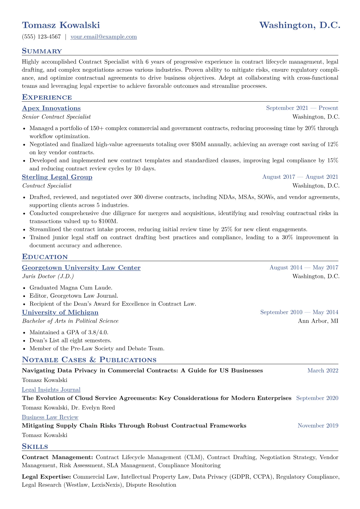A standout Contract Specialist resume in the legal field emphasizes precision, compliance, and risk management. Hiring managers seek candidates adept at navigating complex legal frameworks, demonstrating expertise in contract lifecycle management, negotiation, drafting, and regulatory adherence. Specific achievements like reducing contract review cycles by a measurable percentage, identifying significant cost savings through vendor agreement renegotiation, or successfully mitigating legal risks across diverse portfolios resonate strongly. Essential terminology includes UCC, GDPR, HIPAA, or specific industry regulations, alongside familiarity with legal tech tools. Certifications such as a paralegal certificate or a law degree are often highly valued.