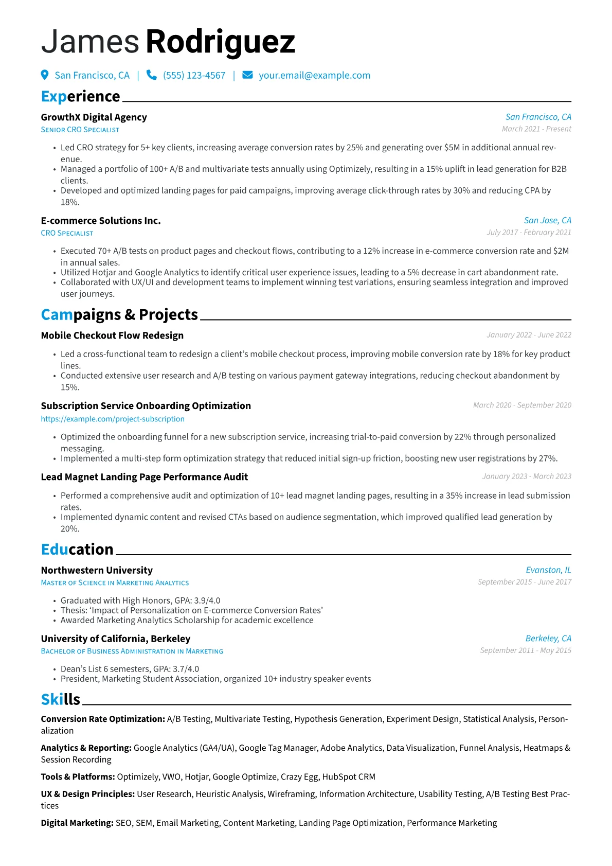 A strong Conversion Rate Optimization Specialist resume effectively showcases a candidate's ability to drive measurable business growth. Hiring managers in Marketing & Advertising prioritize candidates who demonstrate a clear impact on key metrics like conversions, revenue, and lead generation, often through A/B testing and user journey analysis. The unique challenge is quantifying success across diverse projects and platforms.