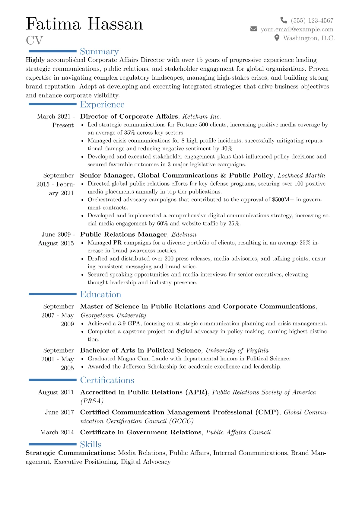 This template was built with JobSprout and can be remixed to create your own tailored Corporate Affairs Director resume.