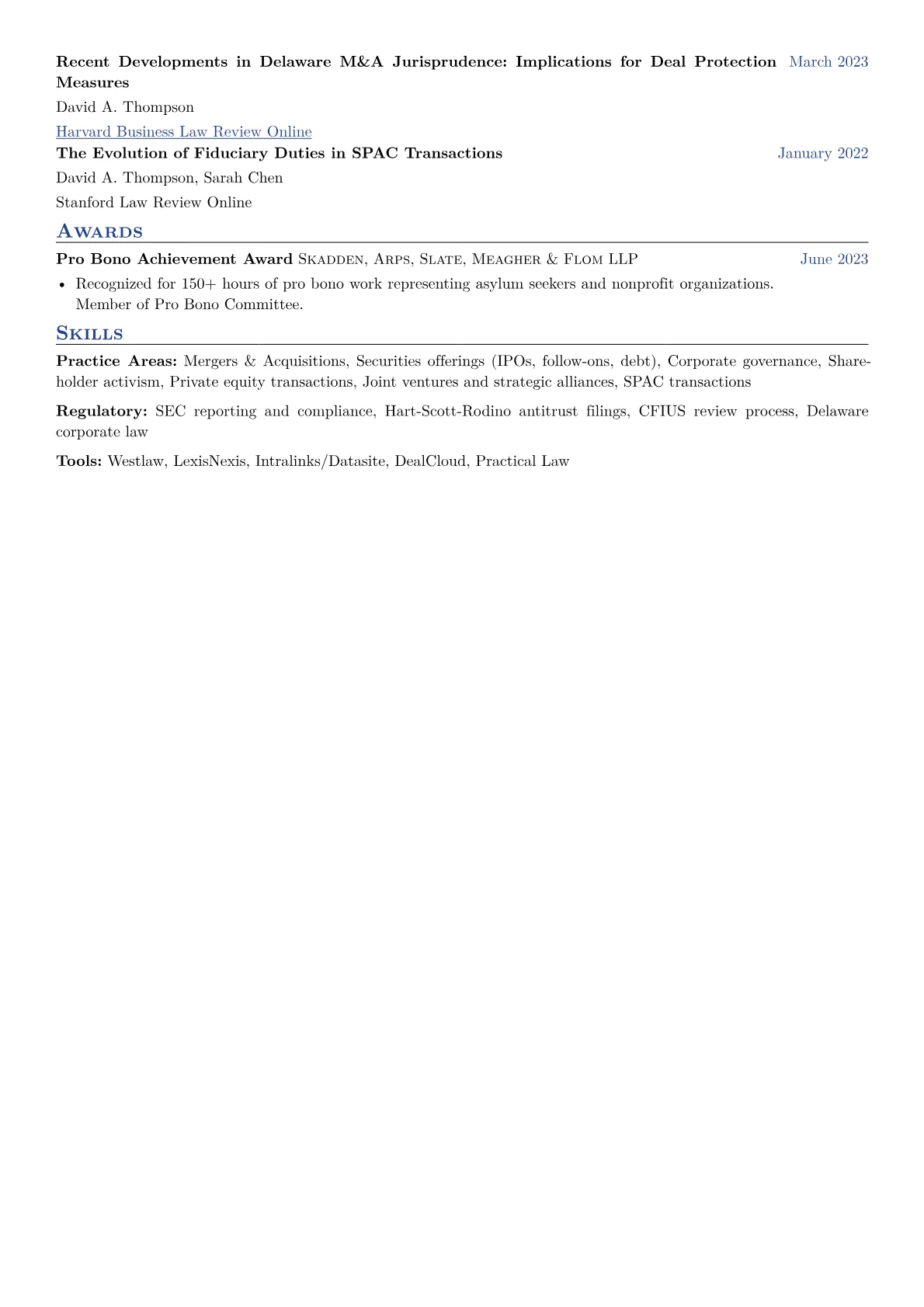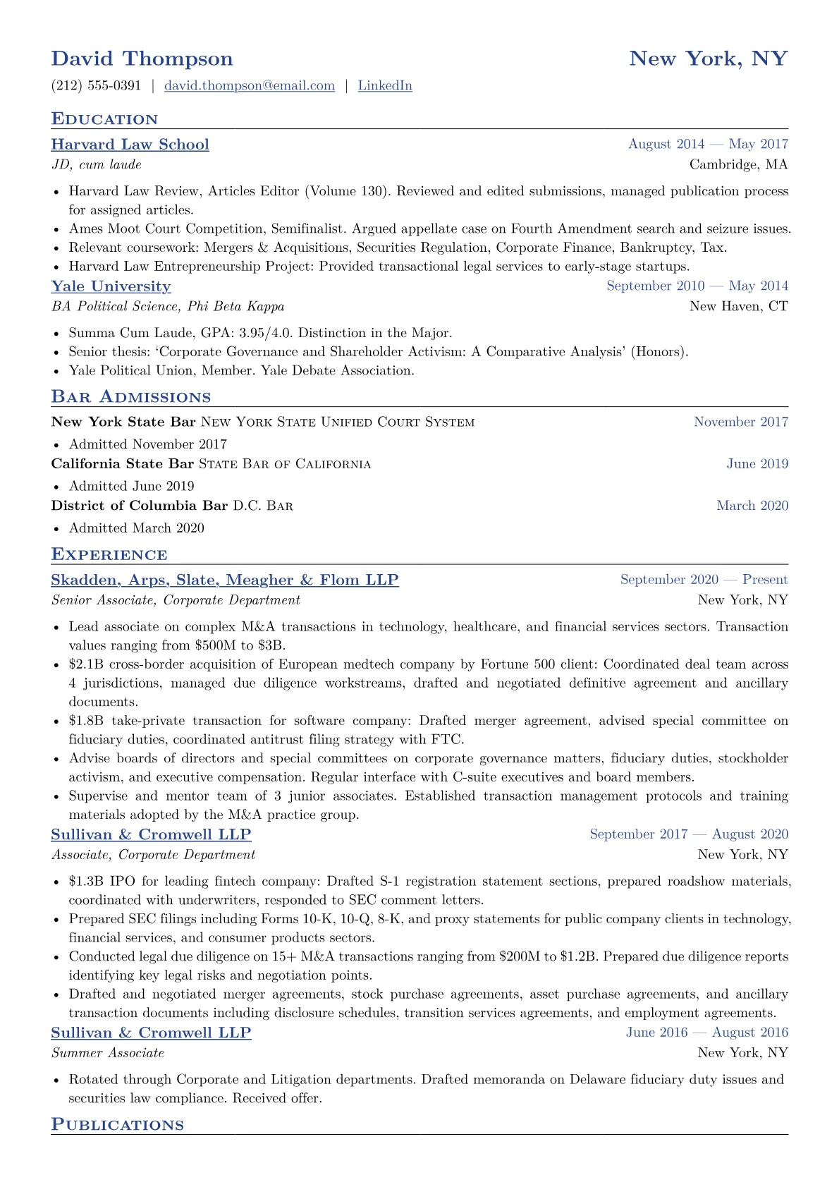 The experience section focuses on transactions, not responsibilities. "$2.1B cross-border acquisition" tells the story. "Advised clients on M&A matters" does not. Deal size is the currency of BigLaw.