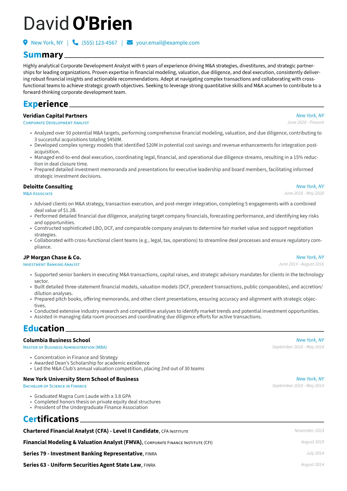 This example CV excels at presenting the core competencies vital for the position. Achievements are consistently quantified, highlighting impact such as "identified 15% operational synergies" or "reduced integration timelines by three months." Skills are logically grouped into categories like "Strategic Analysis," "Operational Due Diligence," and "Financial Modeling," making a candidate's expertise immediately clear. The resume also effectively showcases specific tools and certifications relevant to a Corporate Development Analyst, embedding these technical proficiencies directly within the experience section to reinforce their practical application.