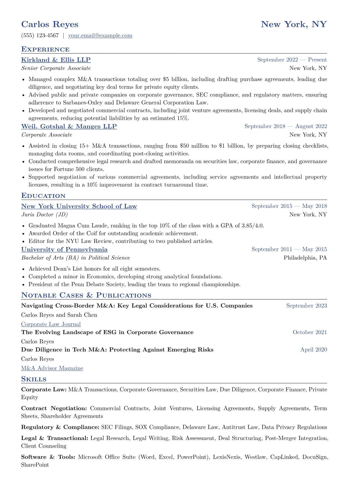 Hiring managers for Corporate Lawyer roles prioritize demonstrable experience in complex transactions, regulatory compliance, and risk mitigation. A strong resume clearly highlights a candidate's ability to navigate high-stakes legal environments while understanding business objectives. The unique challenge lies in precisely articulating these nuanced legal contributions and their tangible impact.