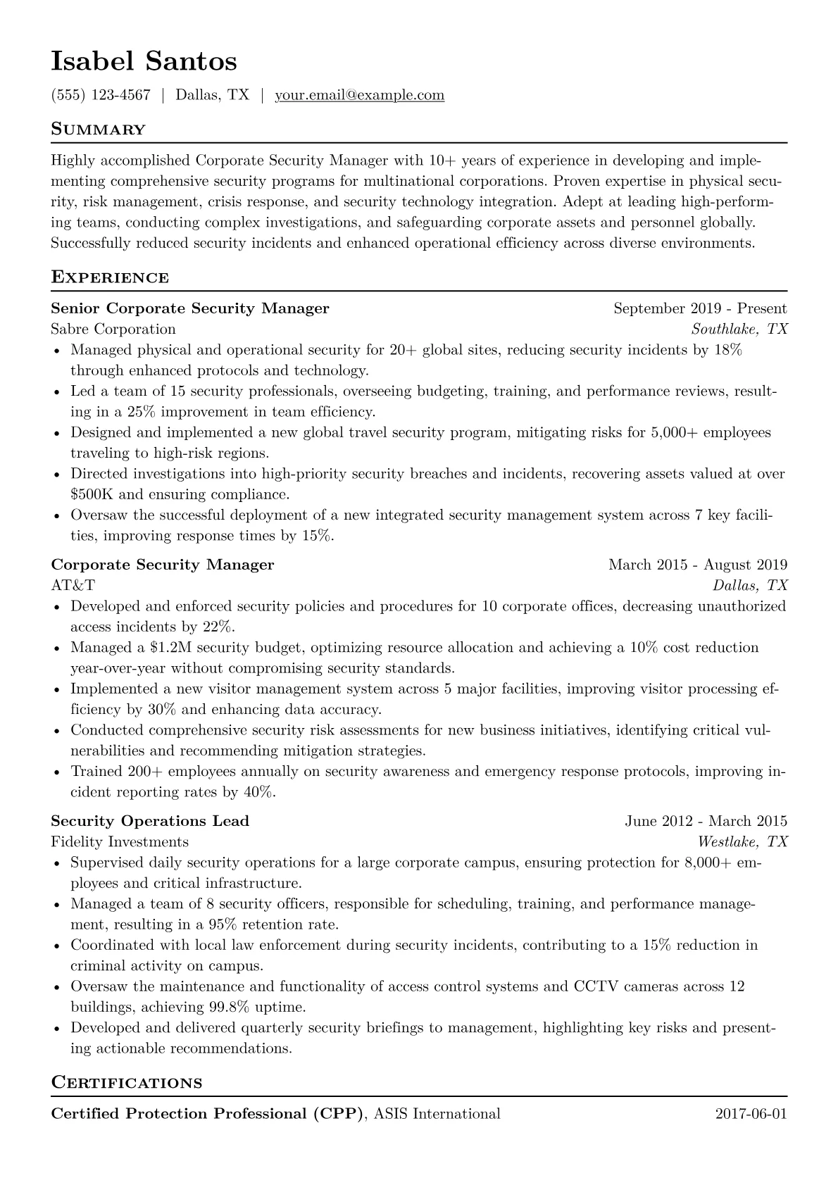 This template was built with JobSprout and can be remixed to create your own tailored Corporate Security Manager resume.