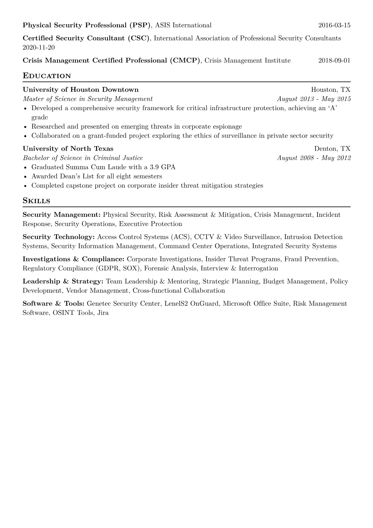 This example CV excels by showcasing achievements with precise quantification, such as "Reduced vulnerabilities by X%," demonstrating clear impact. Skills are logically grouped into categories like "Physical Security," "Cybersecurity Operations," and "Compliance & Risk Management," making the candidate's expertise immediately apparent. Critical certifications and proficiency with industry-standard tools like SIEM platforms, access control systems, and GRC software are prominently highlighted, assuring recruiters of technical acumen relevant to a senior security role.