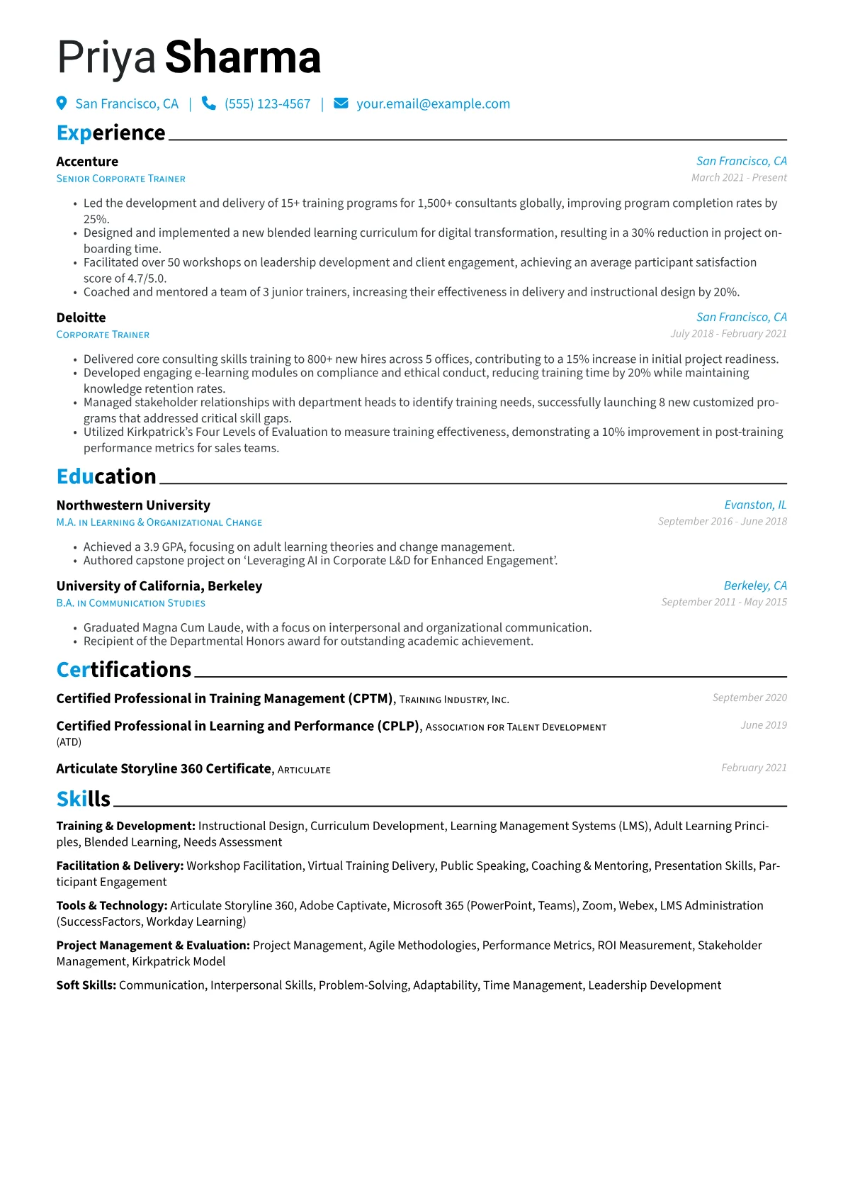 A strong Corporate Trainer resume in the consulting sector emphasizes adaptable training methodologies and a clear track record of improving client and internal team performance. Hiring managers seek evidence of successful client engagement, the ability to translate complex HR strategies into actionable learning, and demonstrable impact on business outcomes. The unique challenge lies in showcasing the ability to deliver measurable value across diverse client contexts.